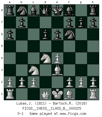 Last move : 0-1 2015 July 10 15:47:2 [Event "FICGS__CHESS__CLASS_B__000225"] [Site "FICGS"] [Date "2015.05.27"] [Round "1"] [White "Lubas,Jozef"] [Black "Bartsch,Reinhard Andrea"] [Result "0-1"] [WhiteElo "1821"] [BlackElo "2018"] 1.e4 c5 2.Nf3 d6 3.d4 Nf6 4.Nc3 cxd4 5.Nxd4 a6 6.Be3 e6 0-1 This chess game has been lost on time (started : 2015.05.27 14:4:14) Sicilian Player Black won this chess game. Follow this game move after move (download)Many Chess players were surprised when after the game, Fischer quietly explained: 'I had already analyzed this possibility' in a position which I thought was not possible to foresee from the opening. (Mikhail Tal) Rubinstein ist ein Turmendspiel, welches die Götter vor tausenden von Jahren begannen. (Savielly Grigorievitsch Tartakower) No soy una persona materialista y por eso, no resiento la falta o pérdida del dinero. La ausencia de cosas mundanas carece de importancia. Ya que el Ajedrez es una forma en la que puedo ser tan materialista como yo desee sin tener la necesidad de vender mi alma. (Jamie Walter Adams) Le joueur d'Echecs qui veut atteindre le top est obligé de développer son propre credo créatif. Alexeï Stepanovicth Souétine. Il est facile d'écrire des livres ! Ce qui est difficile, c'est de jouer ! (Alexeï Stepanovicth Souétine) Whoever said the pen is mightier than the sword obviously never encountered automatic weapons. (US General Douglas MacArthur)