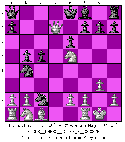 Last move : 1-0 2015 May 29 2:17:39 [Event "FICGS__CHESS__CLASS_B__000225"] [Site "FICGS"] [Date "2015.05.27"] [Round "1"] [White "Ocloz,Laurie"] [Black "Stevenson,Wayne"] [Result "1-0"] [WhiteElo "2000"] [BlackElo "1900"] 1.d4 e6 2.c4 d5 3.Nf3 Nf6 4.g3 c5 5.Bg2 dxc4 6.O-O Nc6 7.Qa4 Bd7 8.Qxc4 b5 9.Qc3 Nd5 10.Qd3 Ndb4 11.Qd1 Nxd4 12.Ne5 Ndc2 13.Bxa8 Qxa8 14.Qxd7+ 1-0 Queen's pawn Kingside Castling by player White (move 6) Player White won this chess game. Follow this game move after move (download)Chess holds its master in its own bonds, shackling the mind and brain so that the inner freedom of the very strongest must suffer. (Albert Einstein) Der zweitbeste Zug ist oft der einzig richtige. (Savielly Grigorievitsch Tartakower) Yo no creo en la psicología. Yo creo en las buenas movidas. (Bobby Fischer) Seul un grand joueur sait à quel point il joue faiblement. (Xavier Tartacover) Being number two sucks. (Andre Agassi)