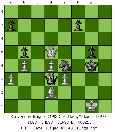 Last move : 0-1 2015 July 22 0:21:9 [Event "FICGS__CHESS__CLASS_B__000225"] [Site "FICGS"] [Date "2015.05.27"] [Round "1"] [White "Stevenson,Wayne"] [Black "Tkac,Matus"] [Result "0-1"] [WhiteElo "1900"] [BlackElo "1997"] 1.c4 e5 2.g3 c6 3.Bg2 d5 4.cxd5 cxd5 5.d4 e4 6.Nc3 Nc6 7.f3 exf3 8.Nxf3 Nf6 9.O-O Be7 10.Qd3 Nb4 11.Qb1 Nc6 12.Qd3 O-O 13.a3 h6 14.Nh4 Be6 15.Nf5 Rc8 16.b4 Re8 17.Nxe7+ Nxe7 18.Bd2 Rc4 19.Bxh6 Ne4 20.Bd2 Nf5 21.e3 Nxc3 22.Bxc3 Nd6 23.Bb2 Qc8 24.Qb3 Re7 25.Rfc1 Rec7 26.Qd1 Bg4 27.Qf1 Qe6 28.Qf2 Bh3 29.Rxc4 Rxc4 30.Bxh3 Qxh3 31.Qe2 Qc8 32.Qd1 b5 33.Rc1 Ne4 34.Kg2 Ng5 35.g4 Qe6 36.h4 Ne4 37.Qe2 Rxc1 38.Bxc1 Qc6 39.Qe1 Qc2+ 40.Kg1 g6 41.h5 g5 42.Qf1 Nc3 43.h6 Ne4 44.Qe1 Kh7 45.Qf1 Kxh6 46.Qe1 Kg6 47.Kh1 Nf2+ 48.Kg2 Nxg4 49.Bd2 Nf6 50.Qc1 Qe4+ 51.Kf2 Qd3 52.Kg1 Ne4 53.Qc6+ Kh5 54.Qxd5 Kg4 0-1 English Opening Kingside Castling by player White (move 9) Kingside Castling by player Black (move 12) Player Black won this chess game. Follow this game move after move (download)The passion for playing Chess is one of the most unaccountable in the world. (H.G. Wells) Mein erstes Ziel war nicht, die Partie zu gewinnen, sondern eine Figur zu opfern. -- der junge (Wilhelm Steinitz) Evita las multitudes. Haz independientemente tu propio razonamiento. Trata de ser el jugador de Ajedrez, no la pieza de Ajedrez. (Ralph Charell) Les Echecs ont trois composantes : le temps, l'espace et le matériel en dernier. (Mikhail Tal) You must have a dream in order to have it come true. (A.P.J. Kalam)