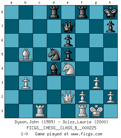 Last move : 1-0 2015 November 18 19:17:27 [Event "FICGS__CHESS__CLASS_B__000225"] [Site "FICGS"] [Date "2015.05.27"] [Round "1"] [White "Dyson,John"] [Black "Ocloz,Laurie"] [Result "1-0"] [WhiteElo "1989"] [BlackElo "2000"] 1.d4 Nf6 2.c4 e6 3.g3 d5 4.Nf3 a6 5.Bg2 dxc4 6.O-O Be7 7.Ne5 O-O 8.Nxc4 Nc6 9.e3 Rb8 10.b3 Qe8 11.e4 b5 12.Ne3 Bb7 13.Bb2 Rd8 14.Nd2 Nb4 15.Qe2 c5 16.dxc5 Bxc5 17.Bxf6 gxf6 18.Ng4 Qe7 19.e5 fxe5 20.Bxb7 f5 21.Bxa6 Bd4 22.Rad1 Nxa2 23.Ne4 Nb4 24.Ngf6+ Kh8 25.Bxb5 fxe4 26.Nxe4 Nd5 27.Rc1 1-0 This chess game has been lost on time (started : 2015.05.27 14:4:14) Catalan Opening Kingside Castling by player White (move 6) Kingside Castling by player Black (move 7) Player White won this chess game. Follow this game move after move (download)Without error there can be no brilliancy. (Emanuel Lasker) Ich kämpfe solange mein Gegner einen Fehler machen kann. (Emanuel Lasker) El Ajedrez es despiadado: debes de estar preparado para matar gente. (Nigel Short) Des combinaisons [dans le jeu d'échecs] pareilles à des mélodies. Je crois entendre pour ainsi dire la musique des coups... (Vladimir Nabokov) Nobody is always a winner, and anybody who says he is, is either a liar or doesn't play poker. (Amarillo Slim)