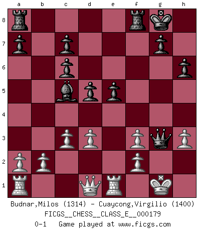 Last move : 0-1 2015 July 12 12:57:25 [Event "FICGS__CHESS__CLASS_E__000179"] [Site "FICGS"] [Date "2015.05.28"] [Round "1"] [White "Budnar,Milos"] [Black "Cuaycong,Virgilio"] [Result "0-1"] [WhiteElo "1314"] [BlackElo "1400"] 1.e4 e5 2.Nf3 Nc6 3.Bb5 f5 4.Nc3 fxe4 5.Nxe4 d5 6.Bxc6+ bxc6 7.Ng3 Bg4 8.h3 Bxf3 9.gxf3 Nf6 10.d3 Bc5 11.O-O O-O 12.Bg5 h6 13.Bd2 Nh7 14.Re1 Ng5 15.Bxg5 Qxg5 16.c3 Qxg3+ 0-1 Ruy Lopez : Schliemann defense, Berger variation Kingside Castling by player White (move 11) Kingside Castling by player Black (move 11) Player Black won this chess game. Follow this game move after move (download)There must have been a time when men were demigods, or they could not have invented Chess. (Gustav Schenk) Der beste Spieler in einem Turnier gewinnt es nie. Er landet auf Platz zwei oder drei. (Siegbert Tarrasch) Si yo gano un torneo, yo lo gano por mí mismo. Yo hago las jugadas. Nadie me ayuda. (Bobby Fischer) Que feriez-vous si vous étiez en train de jouer aux échecs et que la fin du monde arrive ? Je continuerais à jouer. (Saint Borromée) Children in the dark cause accidents, accidents in the dark cause children. (Unknown)
