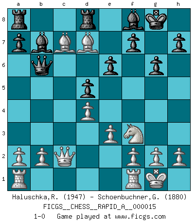 Last move : 1-0 2007 April 30 7:46:4 [Event "FICGS__CHESS__RAPID_A__000015"] [Site "FICGS"] [Date "2007.03.04"] [Round "1"] [White "Haluschka,Rainer"] [Black "Schoenbuchner,Gert"] [Result "1-0"] [WhiteElo "1947"] [BlackElo "1880"] 1.d4 d5 2.c4 c6 3.Nf3 Nf6 4.Nc3 e6 5.Bg5 Be7 6.e3 O-O 7.Bd3 dxc4 8.Bxc4 b5 9.Bd3 Nbd7 10.Qc2 g6 11.O-O Nd5 12.Nxd5 cxd5 13.Bh6 Re8 14.Bxb5 Bf8 15.Bf4 Qb6 16.Bc6 Bb7 17.Bxd7 Red8 18.Bc7 1-0 QGD Slav : 4.Nc3 Kingside Castling by player Black (move 6) Kingside Castling by player White (move 11) Player White won this chess game. Follow this game move after move (download)You sit at the board and suddenly your heart leaps. Your hand trembles to pick up the piece and move it. But what Chess teaches you is that you must sit there calmly and think about whether it's really a good idea and whether there are other better ideas. (Stanley Kubrick) Die Auseinandersetzung mit Karpow war politisch geprägt. Er stand für das kommunistische System, wurde von dessen Repräsentanten gehätschelt. Ich war der Oppositionelle. Jeder Schachweltmeister spiegelt auch die gesellschaftlichen Verhältnisse wider. Kramnik steht für die Börsen-Generation des Neuen Markts, ideologiefrei, zahlenfixiert. (Garry Kasparov) En el Ajedrez, cuando menos, el valiente hereda la tierra. (Edmar Mednis) Les Echecs mettent en conflit, non pas deux intelligences, mais deux volontés. (Lasker) It is not enough to be a good player... you must also play well. (Siegbert Tarrasch)
