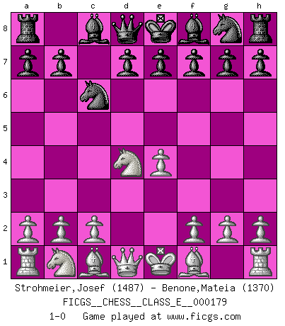 Last move : 1-0 2015 July 15 4:47:9 [Event "FICGS__CHESS__CLASS_E__000179"] [Site "FICGS"] [Date "2015.05.28"] [Round "1"] [White "Strohmeier,Josef"] [Black "Benone,Mateia"] [Result "1-0"] [WhiteElo "1487"] [BlackElo "1370"] 1.e4 c5 2.Nf3 Nc6 3.d4 cxd4 4.Nxd4 1-0 This chess game has been lost on time (started : 2015.05.28 13:48:31) Sicilian defense Player White won this chess game. Follow this game move after move (download)The game of Chess is not merely an idle amusement; several very valuable qualities of the mind are to be acquired and strengthened by it, so as to become habits ready on all occasions; for life is a kind of Chess. (Benjamin Franklin) Ich bin stolz ein Bulgare zu sein. (Veselin Topalov) La señal de un Gran Maestro es su habilidad de ganar una partida rápidamente y sin dolor. (Irving Chernev) L'ordinateur a tué l'originalité. Il n'y a plus guère d'aventures sur l'échiquier. (Jacob Murray) There is no instance of a country having benefited from prolonged warfare. (Sun Tzu)
