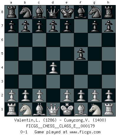 Last move : 0-1 2015 July 8 3:29:53 [Event "FICGS__CHESS__CLASS_E__000179"] [Site "FICGS"] [Date "2015.05.28"] [Round "1"] [White "Valentin,Laurentiu"] [Black "Cuaycong,Virgilio"] [Result "0-1"] [WhiteElo "1286"] [BlackElo "1400"] 1.d4 f5 0-1 This chess game has been lost on time (started : 2015.05.28 13:48:31) Dutch Player Black won this chess game. Follow this game move after move (download)Chess is in its essence a game, in its form an art, and in its execution a science. (Baron Tassilo) Die westlichen Werte sind eine Sprache, welche die Putin-Administration nicht versteht. (Garry Kasparov) El Ajedrez es tortura mental. (Garry Kasparov) Les échecs sont plus proches de l'art de l'assassinat que de l'art de la guerre. (Arturo Perez-Reverte) Whoever said the pen is mightier than the sword obviously never encountered automatic weapons. (US General Douglas MacArthur)