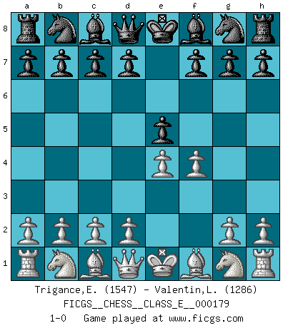 Last move : 1-0 2015 July 8 3:29:53 [Event "FICGS__CHESS__CLASS_E__000179"] [Site "FICGS"] [Date "2015.05.28"] [Round "1"] [White "Trigance,Emile"] [Black "Valentin,Laurentiu"] [Result "1-0"] [WhiteElo "1547"] [BlackElo "1286"] 1.e4 e5 2.f4 1-0 This chess game has been lost on time (started : 2015.05.28 13:48:31) King's gambit Player White won this chess game. Follow this game move after move (download)Examine moves that smite! A good eye for smites is far more important than a knowledge of strategical principles. (Purdy) Es tut gut, die Entwicklungsperiode von, [...] demokratischem Geist durchdringen zu lassen. Wie undemokratisch wäre es doch beispielsweise, den einen Offizier große Spaziertouren vornehmen zu lassen, während die anderen zu Hause säßen und sich entsetzlich langweilten. (Aaron Nimzowitsch) La vida es como el Ajedrez, con lucha, competición y eventos buenos y malos. (Benjamin Franklin) On entre au jeu d'Echecs comme on entre en Religion. Pour le joueur d'Echecs, la partie d'Echecs c'est l'office, la messe, le défilé du 1er Mai, le dépôt de gerbe au Monument aux Morts. C'est un drame sacré. (Michel Roos) Computer Science is no more about computers than astronomy is about telescopes. (Edsger W. Dijkstra)