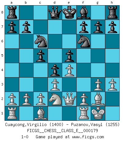 Last move : 1-0 2015 July 12 16:24:25 [Event "FICGS__CHESS__CLASS_E__000179"] [Site "FICGS"] [Date "2015.05.28"] [Round "1"] [White "Cuaycong,Virgilio"] [Black "Puzanov,Vasyl"] [Result "1-0"] [WhiteElo "1400"] [BlackElo "1255"] 1.Nf3 Nf6 2.g3 d5 3.Bg2 c5 4.O-O Bg4 5.d3 Nc6 6.Nbd2 e6 7.e4 d4 8.h3 Bxf3 9.Qxf3 e5 10.Qe2 1-0 This chess game has been lost on time (started : 2015.05.28 13:48:31) Reti Opening Kingside Castling by player White (move 4) Player White won this chess game. Follow this game move after move (download)Is Bobby Fischer quite sane ? (Salo Flohr) Immer nach dem besten Zug zu suchen ist ziemlich unpraktisch. (Nigel Short) Una mala movida nulifica cuarenta buenas. (Horowitz) Si je n'étais pas joueur d'échecs, je serais le meilleur dans quelque chose d'autre. (Anatoli Karpov) Train yourself to let go of everything you fear to lose. (Master Yoda in Star Wars ep.3)