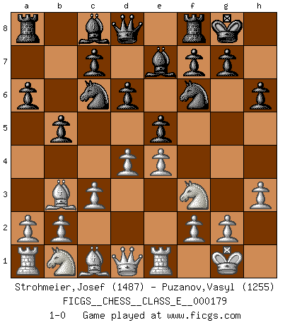 Last move : 1-0 2015 July 19 18:5:45 [Event "FICGS__CHESS__CLASS_E__000179"] [Site "FICGS"] [Date "2015.05.28"] [Round "1"] [White "Strohmeier,Josef"] [Black "Puzanov,Vasyl"] [Result "1-0"] [WhiteElo "1487"] [BlackElo "1255"] 1.e4 e5 2.Nf3 Nc6 3.Bb5 a6 4.Ba4 b5 5.Bb3 h6 6.O-O Nf6 7.c3 Be7 8.Re1 O-O 9.d4 d6 10.h3 1-0 This chess game has been lost on time (started : 2015.05.28 13:48:31) Ruy Lopez : Caro variation Kingside Castling by player White (move 6) Kingside Castling by player Black (move 8) Player White won this chess game. Follow this game move after move (download)Suddenly it was obvious to me in my analysis I had missed what Fischer had found with the greatest of ease at the board. (Mikhail Botvinnik) Kleine Schachspieler machen Mist, und große Schachspieler machen Mist, aber große machen weniger Mist. (Fritz Sämisch) Preferería tener un Peón que un dedo. (Reuben Fine) Tout change constamment, y compris dans le monde des Echecs. (Botvinnik) Nothing is more important for teaching us to understand the concepts we have than constructing fictitious ones. (Ludwig Wittgenstein)