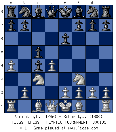Last move : 0-1 2015 July 9 3:41:14 [Event "FICGS__CHESS__THEMATIC_TOURNAMENT__000193"] [Site "FICGS"] [Date "2015.05.29"] [Round "1"] [White "Valentin,Laurentiu"] [Black "Schuett,Wilhelm"] [Result "0-1"] [WhiteElo "1286"] [BlackElo "1800"] 1.d4 d5 2.c4 e6 3.Nc3 c6 4.Nf3 dxc4 5.a4 c5 0-1 This chess game has been lost on time (started : 2015.05.29 14:9:19) QGD : Semi-Slav, Noteboom variation Player Black won this chess game. Follow this game move after move (download)We must make sure that Chess will not be like a dead language, very interesting, but for a very small group. (Sytze Faber) Den Ruhm habe ich schon, jetzt brauche ich noch das Geld. (Wilhelm Steinitz) Debió haber existido una vez en que los hombres eran semidióses, de otra manera no hubiesen podido inventar el Ajedrez. (Gustav Schenk) La conception d'un plan est le processus par lequel un joueur exploite les avantages de sa position tout en s'efforçant d'en réduire au minimum les inconvénients. Afin de garantir le succès, un plan doit toujours se fonder sur un diagnostic objectif des particularités d'une position. La conception d'un plan est d'autant plus difficile que la position est équilibrée, et grandement facilitée lorsqu'il n'existe qu'un seul plan susceptible de répondre aux exigences de la position. (Harry Golombek) Establishing goals is all right if you don't let them deprive you of interesting detours. (Doug Larson)