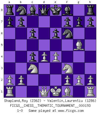 Last move : 1-0 2015 July 14 16:42:6 [Event "FICGS__CHESS__THEMATIC_TOURNAMENT__000193"] [Site "FICGS"] [Date "2015.05.29"] [Round "1"] [White "Shapland,Roy"] [Black "Valentin,Laurentiu"] [Result "1-0"] [WhiteElo "2362"] [BlackElo "1286"] 1.d4 d5 2.c4 e6 3.Nc3 c6 4.Nf3 dxc4 5.Bg5 Nf6 6.e4 1-0 This chess game has been lost on time (started : 2015.05.29 14:9:19) QGD : Semi-Slav, Noteboom variation Player White won this chess game. Follow this game move after move (download)You cannot play at Chess if you are kind-hearted. (French Proverb) Darum geht es im Schach. Einen Tag gibst du deinem Gegner eine Lektion, am nächsten Tag gibt er dir eine. (Robert James Fischer) Fischer sacrificó virtualmente todo lo que la mayoría de nosotros los 'debiles' (término que él usa) valoramos, respetamos y apreciamos por el amor de un astuto, a menudo hermoso tablero de juego, por el privilegio ambivalente de ser su mas grande maestro. (Paul Kollar) Il s'avisa de me proposer d'apprendre les échecs qu'il jouait un peu... me voilà forcené des échecs. J'achète un échiquier, je m'enferme dans ma chambre, j'y passe des jours et des nuits à vouloir apprendre par cur toutes les parties. (Jean-Jacques Rousseau, Confessions) Indecision is the key to flexibility. (Unknown)
