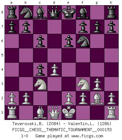 Last move : 1-0 2015 July 12 16:24:25 [Event "FICGS__CHESS__THEMATIC_TOURNAMENT__000193"] [Site "FICGS"] [Date "2015.05.29"] [Round "1"] [White "Teverovski,Bogoljub"] [Black "Valentin,Laurentiu"] [Result "1-0"] [WhiteElo "2084"] [BlackElo "1286"] 1.d4 d5 2.c4 e6 3.Nc3 c6 4.Nf3 dxc4 5.g3 Nf6 6.Bg2 1-0 This chess game has been lost on time (started : 2015.05.29 14:9:19) QGD : Semi-Slav, Noteboom variation Player White won this chess game. Follow this game move after move (download)A bad plan is better than none at all. (Frank Marshall) Oft bringt ein stiller Zug das Erdbeben. (Richard Reti) Todos los Maestros de Ajedrez fueron un día unos principiantes. (Chernev) Un journaliste : 'Vous préférez avoir une dame de plus sur l'échiquier ou au lit ?' Boris Spassky : 'Ca dépend de la position.' Yoga is 99% practice and 1% knowledge. (Sri Krishna Pattabhi Jois)