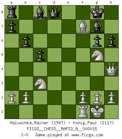 Last move : 1-0 2007 May 21 1:37:44 [Event "FICGS__CHESS__RAPID_A__000015"] [Site "FICGS"] [Date "2007.03.04"] [Round "1"] [White "Haluschka,Rainer"] [Black "Konig,Paul"] [Result "1-0"] [WhiteElo "1947"] [BlackElo "2117"] 1.d4 Nf6 2.c4 g6 3.Nf3 Bg7 4.Nc3 d5 5.Qb3 dxc4 6.Qxc4 O-O 7.e4 Na6 8.Be2 c5 9.d5 e6 10.O-O exd5 11.exd5 b6 12.Qh4 Nxd5 13.Bg5 f6 14.Bc4 Nac7 15.Rad1 fxg5 16.Nxg5 h6 17.Rxd5 Nxd5 18.Bxd5+ Rf7 19.Bxf7+ 1-0 King's Indian, 3.Nf3 Kingside Castling by player Black (move 6) Kingside Castling by player White (move 10) Player White won this chess game. Follow this game move after move (download)Chess is like war on a board. (Bobby Fischer) Du kannst im Schach nur gut werden, wenn du das Spiel liebst. (Robert James Fischer) El Ajedrez es realmente noventa y nueve por ciento calculación. (Soltis) C'est une question de caractère, Beaucoup de gens perdent leur motivation très vite. D'autres, ils sont rares, peuvent la conserver très longtemps. J'aime les échecs, encore aujourd'hui je suis heureux d'analyser des parties. J'aime toujours gagner, je déteste encore perdre. Bien jouer est important pour mon intégrité intellectuelle et morale. Et puis les échecs vivent en ce moment une période historique grâce à Internet. Ils se développent dans les systèmes éducatifs à travers le monde. Ils sortent de leur ghetto, et c'est mon rôle de mener à bien cette révolution. (Gary Kasparov) They say poker is a zero-sum game. It must be, because every time I play my sum ends up zero. (Max Shapiro)