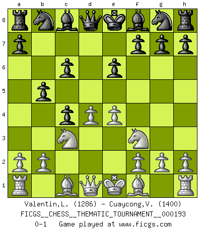 Last move : 0-1 2015 July 9 3:41:14 [Event "FICGS__CHESS__THEMATIC_TOURNAMENT__000193"] [Site "FICGS"] [Date "2015.05.29"] [Round "1"] [White "Valentin,Laurentiu"] [Black "Cuaycong,Virgilio"] [Result "0-1"] [WhiteElo "1286"] [BlackElo "1400"] 1.d4 d5 2.c4 e6 3.Nc3 c6 4.Nf3 dxc4 5.e4 b5 0-1 This chess game has been lost on time (started : 2015.05.29 14:9:19) QGD : Semi-Slav, Noteboom variation Player Black won this chess game. Follow this game move after move (download)Chess, like any creative activity, can exist only through the combined efforts of those who have creative talent, and those who have the ability to organize their creative work. (Mikhail Botvinnik) Frage des Reporters: -Welche besonderen Umstände rechtfertigen das Anhalten der Uhren während einer Turnierpartie? Antwort: -Einen Fotographen zu strangulieren. (Siegbert Tarrasch) Después de la respuesta de las negras a 1.e4 con 1..e5, se quedan siempre tratando de entrar dentro del juego. (Howard Staunton) Toutes les manuvres exécutées sur une colonne ouverte ont pour but ultime l'intrusion définitive sur la septième ou la huitième rangée, en plein cur de la position ennemie. (Aaron Nimzovitch) You can only get smarter by playing a smarter opponent. (Revolver, movie)