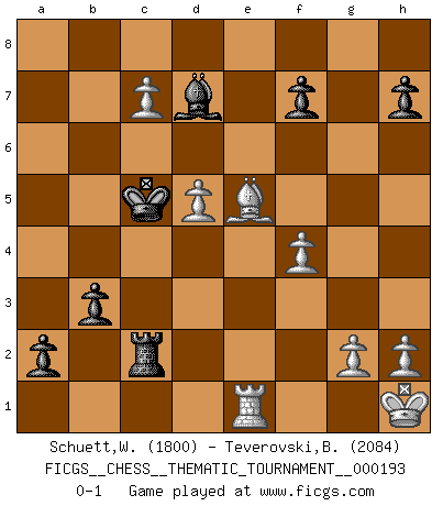 Last move : 0-1 2016 January 30 1:13:2 [Event "FICGS__CHESS__THEMATIC_TOURNAMENT__000193"] [Site "FICGS"] [Date "2015.05.29"] [Round "1"] [White "Schuett,Wilhelm"] [Black "Teverovski,Bogoljub"] [Result "0-1"] [WhiteElo "1800"] [BlackElo "2084"] 1.d4 d5 2.c4 e6 3.Nc3 c6 4.Nf3 dxc4 5.a4 Bb4 6.e3 b5 7.Bd2 a5 8.axb5 Bxc3 9.Bxc3 cxb5 10.b3 Bb7 11.bxc4 b4 12.Bb2 Nf6 13.Bd3 O-O 14.O-O Nbd7 15.Nd2 Qc7 16.f4 a4 17.Rb1 Bc6 18.e4 a3 19.Ba1 Qb7 20.d5 exd5 21.exd5 Qb6+ 22.Kh1 Ba4 23.Qf3 Rfe8 24.Ne4 a2 25.Rb2 Nxe4 26.Bxe4 Nf6 27.Re2 Rxe4 28.Rxe4 Nxe4 29.Qxe4 Re8 30.Qd3 Qe3 31.Qxe3 Rxe3 32.c5 b3 33.c6 Re2 34.c7 Bd7 35.Rc1 Rc2 36.Re1 Kf8 37.Be5 Ke7 38.Bxg7 Kd6 39.Be5+ Kc5 0-1 This chess game has been lost on time (started : 2015.05.29 14:9:19) QGD : Semi-Slav, Abrahams variation Kingside Castling by player Black (move 13) Kingside Castling by player White (move 14) Player Black won this chess game. Follow this game move after move (download)Chess is a sea in which a gnat may drink and an elephant may bathe. (Hindu proverb) Das Spiel gibt uns die Genugtuung, die das Leben uns versagt. (Emanuel Lasker) Un entendimiento a fondo de las continuaciones típicas del mate, hace de las combinaciones de sacrificio mas complicadas conducirlas a ellas no solo sin dificultad, sino casi de una manera natural. (Siegbert Tarrasch) Psychologiquement, tu dois avoir confiance en toi même, mais cette confiance doit être basée sur des faits. (Robert Fischer) Only sick music makes money today. (Friedrich Nietzsche)