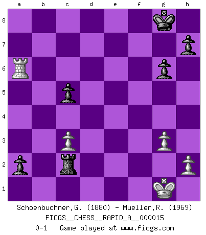 Last move : 0-1 2007 April 8 16:26:45 [Event "FICGS__CHESS__RAPID_A__000015"] [Site "FICGS"] [Date "2007.03.04"] [Round "1"] [White "Schoenbuchner,Gert"] [Black "Mueller,Robert"] [Result "0-1"] [WhiteElo "1880"] [BlackElo "1969"] 1.e4 c5 2.Nc3 Nc6 3.g3 g6 4.f4 d6 5.Nf3 Bg7 6.Bg2 e6 7.O-O Nge7 8.d3 O-O 9.Rb1 b6 10.Be3 d5 11.exd5 exd5 12.d4 Bg4 13.Ne2 Nf5 14.Bf2 Nfxd4 15.Nfxd4 Nxd4 16.Bxd4 Bxd4+ 17.Kh1 Re8 18.Bf3 Bxf3+ 19.Rxf3 Be3 20.f5 d4 21.fxg6 fxg6 22.Nf4 Bxf4 23.Rxf4 Qd5+ 24.Kg1 Qxa2 25.c3 dxc3 26.bxc3 Rad8 27.Qb3+ Qxb3 28.Rxb3 Re2 29.Rf2 Rd1+ 30.Kg2 Rxf2+ 31.Kxf2 Rd2+ 32.Kg1 Rc2 33.Ra3 a5 34.Rb3 a4 35.Rxb6 a3 36.Ra6 a2 0-1 Sicilian : Closed Kingside Castling by player White (move 7) Kingside Castling by player Black (move 8) Player Black won this chess game. Follow this game move after move (download)It is peculiar but a fact nevertheless, that gamblers in chess always have enthusiastic followers. (Botvinnik) Ich verachte Kasparow. (Viktor Kortschnoi) Un Peón pasado es un criminal, quién debe ser mantenido bajo candado y llave. Leves medidas, tales como vigilancia policiaca, no son suficientes. (Aaron Nimzovich) Si je n'étais pas joueur d'échecs, je serais le meilleur dans quelque chose d'autre. (Anatoli Karpov) Looking at the proliferation of personal web pages on the Net, it looks like very soon everyone on Earth will have 15 megabytes of fame. (M.G. Sriram)