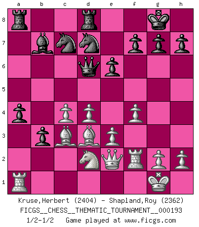 Last move : 1/2-1/2 2015 June 14 15:32:21 [Event "FICGS__CHESS__THEMATIC_TOURNAMENT__000193"] [Site "FICGS"] [Date "2015.05.29"] [Round "1"] [White "Kruse,Herbert"] [Black "Shapland,Roy"] [Result "1/2-1/2"] [WhiteElo "2404"] [BlackElo "2362"] 1.d4 d5 2.c4 e6 3.Nc3 c6 4.Nf3 dxc4 5.e3 b5 6.a4 Bb4 7.Bd2 a5 8.axb5 Bxc3 9.Bxc3 cxb5 10.b3 Bb7 11.bxc4 b4 12.Bb2 Nf6 13.Bd3 O-O 14.O-O Nbd7 15.Nd2 Qc7 16.f4 a4 17.Rb1 Rfd8 18.Qe2 Qd6 19.Ba1 b3 20.Bc3 Ne8 21.Rf2 Nc7 22.Ra1 1/2-1/2 QGD : Semi-Slav, Noteboom variation Kingside Castling by player Black (move 13) Kingside Castling by player White (move 14) This chess game ended in a draw. Follow this game move after move (download)A Chess game is a dialogue, a conversation between a player and his opponent. Each move by the opponent may contain threats or be a blunder, but a player cannot defend against threats or take advantage of blunders if he does not first ask himself: What is my opponent planning after each move ? (Bruce A. Moon) Mein Gehirn das ist mein zweitwichtigstes Organ [Aus dem Film: Der Schläfer]. (Woody Allen) La maestría del Ajedrez consiste esencialmente en analizar posiciónes de Ajedrez con precisión. (Mikhail Botvinnik) Le succès, c'est être capable d'aller d'échec en échec sans perdre son enthousiasme. (Winston Churchill) Good decisions come from experience, and experience comes from bad decisions. (Anonymous)