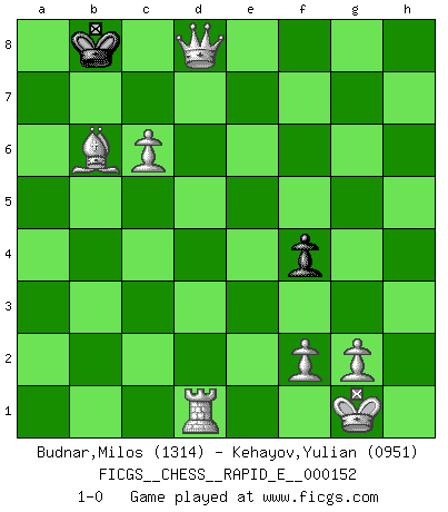 Last move : 1-0 2015 September 25 6:26:0 [Event "FICGS__CHESS__RAPID_E__000152"] [Site "FICGS"] [Date "2015.05.31"] [Round "1"] [White "Budnar,Milos"] [Black "Kehayov,Yulian"] [Result "1-0"] [WhiteElo "1314"] [BlackElo "0951"] 1.e4 e5 2.Nf3 d6 3.d4 exd4 4.Nxd4 c5 5.Bb5+ Bd7 6.Bxd7+ Qxd7 7.Nf3 Nc6 8.O-O Nf6 9.Nc3 Be7 10.Nd5 Nxd5 11.exd5 Ne5 12.h3 O-O 13.Bf4 Nxf3+ 14.Qxf3 b5 15.b3 Rac8 16.Rae1 a5 17.Qg4 Qxg4 18.hxg4 h6 19.Rxe7 c4 20.Bxd6 Rfd8 21.Bc7 Re8 22.Rxe8+ Rxe8 23.Bxa5 cxb3 24.axb3 Rc8 25.c3 Rc5 26.Rd1 Kf8 27.Bb4 Ke8 28.Bxc5 Kd7 29.Bf8 g6 30.Bxh6 Kd6 31.Bf8+ Kd7 32.Bb4 f5 33.gxf5 gxf5 34.c4 bxc4 35.bxc4 f4 36.c5 Kc7 37.Ba5+ Kd7 38.c6+ Kc8 39.d6 Kb8 40.Bb6 Kc8 41.d7+ Kb8 42.d8=Q 1-0 Philidor : Exchange variation Kingside Castling by player White (move 8) Kingside Castling by player Black (move 12) 10 pieces endgame at move 34 : White KRBPPPP , Black KPP WHITE : King + 1 Rook 1 Bishop 4 Pawns BLACK : King + 2 Pawns 9 pieces endgame at move 35 : White KRBPPPP , Black KP WHITE : King + 1 Rook 1 Bishop 4 Pawns BLACK : King + 1 Pawn Promotion Queen by player White (move 42) Player White won this chess game. Follow this game move after move (download)Different people feel differently about resigning. (Bobby Fischer) Nach Morphy wurde nichts neues mehr in der Behandlung offener Positionen gefunden. (Mikhail Moiseyevich Botvinik) Las combinaciones han sido siempre el aspecto más intrigante del Ajedrez. Los Maestros las buscan, el público las aplauden, los críticos las alaban. La razón se debe a que las combinaciones hacen posible que el Ajedrez sea más que un ejercicio matemático con una carencia de vida. Ellas son la poesía del juego, son del Ajedrez lo que la melodía es de la música. Ellas representan el triunfo de la mente sobre la materia. (Reuben Fine) La solitude du joueur d'Echecs à l'approche du mat est semblable à celle du condamné. (Francis Szpiner) Be who you are, and say what you feel because those who mind don't matter, and those who matter don't mind. (Dr Seuss)