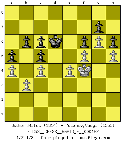Last move : 1/2-1/2 2015 September 27 12:25:2 [Event "FICGS__CHESS__RAPID_E__000152"] [Site "FICGS"] [Date "2015.05.31"] [Round "1"] [White "Budnar,Milos"] [Black "Puzanov,Vasyl"] [Result "1/2-1/2"] [WhiteElo "1314"] [BlackElo "1255"] 1.e4 e5 2.Nf3 Nc6 3.Bb5 a6 4.Ba4 Nf6 5.Nc3 d6 6.h3 Bd7 7.d4 exd4 8.Nxd4 Nxd4 9.Qxd4 Be7 10.O-O O-O 11.Bxd7 Nxd7 12.Nd5 Bf6 13.Nxf6+ Qxf6 14.Qxf6 Nxf6 15.f3 Nd7 16.c4 Nc5 17.b3 Ne6 18.Be3 b6 19.Rfd1 a5 20.a4 Nc5 21.Bxc5 dxc5 22.Rd7 Rac8 23.Rad1 Rfe8 24.g4 Kf8 25.h4 Re7 26.Rd8+ Re8 27.Rxc8 Rxc8 28.Kg2 Ke7 29.f4 f6 30.f5 Rd8 31.Rxd8 Kxd8 32.Kf3 Kd7 33.Kf4 Kd6 34.g5 c6 35.h5 h6 36.g6 Ke7 37.Ke3 Kd6 38.Kf4 1/2-1/2 Ruy Lopez : Four knights (Tarrasch) variation Kingside Castling by player White (move 10) Kingside Castling by player Black (move 10) This chess game ended in a draw. Follow this game move after move (download)First-class players lose to second class players because second-class players sometimes play a first-class game. (Tarrasch) Der Schachmeister von Heute braucht Courage, einen Killerinstinkt, Ausdauer und Arroganz. (Larry Evans) Un entendimiento a fondo de las continuaciones típicas del mate, hace de las combinaciones de sacrificio mas complicadas conducirlas a ellas no solo sin dificultad, sino casi de una manera natural. (Siegbert Tarrasch) Un journaliste : 'Vous préférez avoir une dame de plus sur l'échiquier ou au lit ?' Boris Spassky : 'Ca dépend de la position.' Drag your thoughts away from your troubles... by the ears, by the heels, or any other way you can manage it. (Mark Twain)