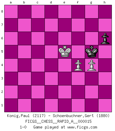 Last move : 1-0 2007 June 3 3:4:28 [Event "FICGS__CHESS__RAPID_A__000015"] [Site "FICGS"] [Date "2007.03.04"] [Round "1"] [White "Konig,Paul"] [Black "Schoenbuchner,Gert"] [Result "1-0"] [WhiteElo "2117"] [BlackElo "1880"] 1.c4 e5 2.Nc3 Nc6 3.g3 d6 4.Bg2 Nf6 5.e3 Bf5 6.d4 Qd7 7.e4 Bg6 8.Nge2 exd4 9.Nxd4 Nxd4 10.Qxd4 Be7 11.O-O O-O 12.Re1 c5 13.Qd1 Rab8 14.Nd5 Nxd5 15.Qxd5 b6 16.e5 Rbd8 17.e6 fxe6 18.Qxe6+ Qxe6 19.Rxe6 Bf6 20.a4 Be5 21.Re7 Bd4 22.Be3 Bxb2 23.Ra2 Be5 24.Rxa7 Bf7 25.Bd5 Bxd5 26.cxd5 Rf5 27.Rb7 Bd4 28.Bxd4 cxd4 29.Rxb6 Rxd5 30.a5 Ra8 31.a6 d3 32.a7 d2 33.Rxd2 Rxd2 34.Rb8+ Kf7 35.Rxa8 Ra2 36.Rd8 Rxa7 37.Rxd6 h6 38.Kg2 Re7 39.h4 Re6 40.Rxe6 Kxe6 41.Kf3 Kf5 42.g4+ Ke5 43.h5 Kf6 44.Kf4 g6 45.hxg6 Kxg6 46.Ke5 Kg5 47.f4+ 1-0 English : Sicilian Reversed Kingside Castling by player White (move 11) Kingside Castling by player Black (move 11) 10 pieces endgame at move 36 : White KRPPP , Black KRPPP WHITE : King + 1 Rook 3 Pawns BLACK : King + 1 Rook 3 Pawns 9 pieces endgame at move 37 : White KRPPP , Black KRPP WHITE : King + 1 Rook 3 Pawns BLACK : King + 1 Rook 2 Pawns 8 pieces endgame at move 40 : White KRPPP , Black KPP WHITE : King + 1 Rook 3 Pawns BLACK : King + 2 Pawns 7 pieces endgame at move 40 : White KPPP , Black KPP WHITE : King + 3 Pawns BLACK : King + 2 Pawns 6 pieces endgame at move 45 : White KPPP , Black KP WHITE : King + 3 Pawns BLACK : King + 1 Pawn 5 pieces endgame at move 45 : White KPP , Black KP WHITE : King + 2 Pawns BLACK : King + 1 Pawn Player White won this chess game. Follow this game move after move (download)Fischer sacrificed virtually everything most of us weakies (to use his term) value, respect, and cherish, for the sake of an artful, often beautiful board game, for the ambivalent privilege of being its greatest master. (Paul Kollar) Ich las kürzlich ein Buch von Nietzsche. Er sagte Religion verdumme nur die Menschen. Ich stimme zu. (Robert James Fischer) El Ajedrez es la vida. (Bobby Fischer) Tous ces prétendus hommes politiques sont les pions, les Cavaliers, les Tours ou les Fous d'une partie d'échecs qui se jouera tant qu'un hasard ne renversera pas l'échiquier. (Honoré de Balzac) Never was anything great achieved without danger. (Niccolo Machiavelli)