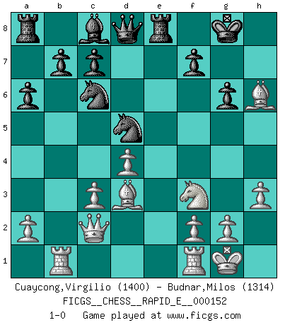 Last move : 1-0 2015 July 18 13:57:11 [Event "FICGS__CHESS__RAPID_E__000152"] [Site "FICGS"] [Date "2015.05.31"] [Round "1"] [White "Cuaycong,Virgilio"] [Black "Budnar,Milos"] [Result "1-0"] [WhiteElo "1400"] [BlackElo "1314"] 1.e4 e5 2.Nf3 Nc6 3.Bc4 Bc5 4.c3 Nf6 5.d4 exd4 6.cxd4 Bb4+ 7.Nc3 Bxc3 8.bxc3 d5 9.exd5 Nxd5 10.O-O O-O 11.Qc2 h6 12.h3 Re8 13.Rb1 a6 14.Bd3 g6 15.Bxh6 1-0 Giuoco Piano : Greco's attack Kingside Castling by player White (move 10) Kingside Castling by player Black (move 10) Player White won this chess game. Follow this game move after move (download)With or without the title, Bobby Fischer was unquestionably the greatest player of his time. (Burt Hochberg) Man braucht nicht immer den besten Zug zu spielen: Ein Zug muß aktiv, unternehmungslustig, korrekt und schön sein. (David Bronstein) Una partida de Ajedrez se divide en 3 etapas: la primera cuando piensas que tienes la ventaja, la segunda cuando crees que tienes la ventaja y la tercera... ¡cuando te das cuenta que vas a perder!. (Savielly Tartakower) La tactique, c'est ce que vous faites quand il y a quelque chose à faire; la stratégie, c'est ce que vous faites quand il n'y a rien à faire. (Savielli Tartacower) Games, world of games... There's always an opponent, and there's always a victim. (Revolver, movie)