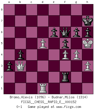 Last move : 0-1 2015 August 18 22:8:8 [Event "FICGS__CHESS__RAPID_E__000152"] [Site "FICGS"] [Date "2015.05.31"] [Round "1"] [White "Bromo,Alexis"] [Black "Budnar,Milos"] [Result "0-1"] [WhiteElo "1096"] [BlackElo "1314"] 1.d4 Nf6 2.c4 e6 3.a3 d5 4.Nc3 c5 5.e3 dxc4 6.Bxc4 a6 7.Nf3 Bd6 8.h3 O-O 9.O-O h6 10.b4 cxb4 11.axb4 Bxb4 12.Bb2 b5 13.Bb3 Bb7 14.Re1 Bd5 15.Bxd5 Nxd5 16.Qc2 Nxc3 17.Bxc3 Bxc3 18.Qxc3 Qd6 19.Ne5 Nd7 20.Nxd7 Qxd7 21.e4 Rfc8 22.Qe3 a5 23.Rec1 a4 24.Rxc8+ Rxc8 25.f4 Rc4 26.Rd1 b4 27.d5 a3 28.Qb3 Rxe4 29.g3 Qa7+ 30.Kg2 Re2+ 31.Kf3 Rf2+ 32.Kg4 f5+ 33.Kh5 Qf7+ 34.Kh4 Qf6+ 35.Kh5 Kh7 36.g4 g6+ 0-1 Queen's pawn game Kingside Castling by player Black (move 8) Kingside Castling by player White (move 9) Player Black won this chess game. Follow this game move after move (download)Life is a kind of Chess, with struggle, competition, good and ill events. (Benjamin Franklin) Schachspieler können ausgezeichnet Varianten am Schachbrett berechnen, aber nicht im realen Leben. Zu stark ist der Individualismus im Schach ausgeprägt, und für viele ist ein kleiner momentaner persönlicher Vorteil wichtiger als ein weit größerer Vorteil von morgen. (Anatoly Karpov) Los Peones son nacidos libres, y aún así, se encuentran encadenados por todos lados. (Rick Kennedy) Ce qui caractérise les parties de combat, c'est que si le défenseur a constamment de difficiles problèmes à résoudre, l'attaquant doit chercher sans relâche de nouvelles possibilités d'attaque. (Koblentz) The faster the computer, the slower the brain. (Thibault de Vassal)