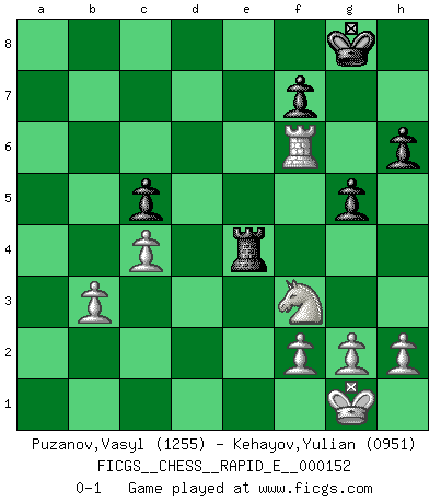 Last move : 0-1 2015 October 23 15:21:56 [Event "FICGS__CHESS__RAPID_E__000152"] [Site "FICGS"] [Date "2015.05.31"] [Round "1"] [White "Puzanov,Vasyl"] [Black "Kehayov,Yulian"] [Result "0-1"] [WhiteElo "1255"] [BlackElo "0951"] 1.e4 e5 2.Nf3 d6 3.d4 exd4 4.Qxd4 h6 5.Bb5+ c6 6.Ba4 b5 7.Bb3 Nf6 8.O-O c5 9.Qe3 Be7 10.a4 O-O 11.axb5 Qb6 12.c4 a6 13.bxa6 Rxa6 14.Rxa6 Qxa6 15.Bd2 Nc6 16.Re1 Na5 17.Bxa5 Qxa5 18.Nbd2 Bb7 19.Bc2 Ba6 20.b3 Re8 21.Nb1 Ng4 22.Qf4 Ne5 23.Nbd2 Nxf3+ 24.Nxf3 g5 25.Qg3 Bf6 26.Rd1 Qc7 27.Qxd6 Qxd6 28.Rxd6 Bb7 29.Rxf6 Bxe4 30.Bxe4 Rxe4 0-1 This chess game has been lost on time (started : 2015.05.31 18:6:41) Philidor : Exchange variation Kingside Castling by player White (move 8) Kingside Castling by player Black (move 10) Player Black won this chess game. Follow this game move after move (download)Chess is not like life... it has rules ! (Mark Pasternak) Mutter, ich bin eben Ex-Weltmeister geworden. --beim nach Hause Kommen nach dem Verlust des WM-Titels an Mihail Botvinnik -- (Mikhail Nekhemyevich Tal) En el Ajedrez, cuando menos, el valiente hereda la tierra. (Edmar Mednis) Il (Jacob Murray) ne joue pas pour le bon coup, mais pour le meilleur. (Eloi Relange) Ah, beer! The cause of, and the solution to, all of life's problems. (Homer Simpson)