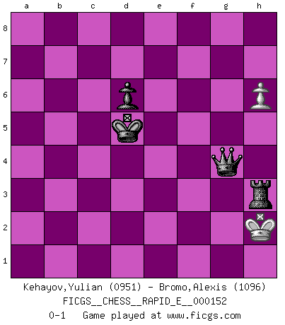 Last move : 0-1 2015 June 20 7:42:49 [Event "FICGS__CHESS__RAPID_E__000152"] [Site "FICGS"] [Date "2015.05.31"] [Round "1"] [White "Kehayov,Yulian"] [Black "Bromo,Alexis"] [Result "0-1"] [WhiteElo "0951"] [BlackElo "1096"] 1.e4 e5 2.Nf3 Nc6 3.d4 exd4 4.Nxd4 Nxd4 5.Qxd4 c5 6.Qc4 h6 7.Be2 d6 8.O-O Ne7 9.Nc3 Be6 10.Qd3 Ng6 11.g3 Be7 12.Bf3 Ne5 13.Qe3 Nxf3+ 14.Qxf3 O-O 15.Nd5 Bxd5 16.exd5 Bg5 17.c4 Re8 18.Bxg5 Qxg5 19.b3 a5 20.Rfe1 Rxe1+ 21.Rxe1 Kf8 22.Qe3 Qxe3 23.Rxe3 a4 24.Kg2 Ra5 25.bxa4 Rxa4 26.a3 Rxc4 27.Rb3 Ra4 28.Rxb7 Rxa3 29.Rd7 Ra6 30.Rc7 g6 31.g4 Kg7 32.f3 Kf6 33.Kg3 Ke5 34.Rxf7 Kxd5 35.Rf6 c4 36.Rxg6 c3 37.Rxh6 c2 38.h4 c1Q 39.h5 Qg1+ 40.Kf4 Qc1+ 41.Kg3 Qxh6 42.Kh3 Ra3 43.Kg3 Qg5 44.Kh3 Rxf3+ 45.Kh2 Qxg4 46.h6 Rh3+ 0-1 Scotch game Kingside Castling by player White (move 8) Kingside Castling by player Black (move 14) 10 pieces endgame at move 36 : White KRPPP , Black KRPPP WHITE : King + 1 Rook 3 Pawns BLACK : King + 1 Rook 3 Pawns 9 pieces endgame at move 37 : White KRPPP , Black KRPP WHITE : King + 1 Rook 3 Pawns BLACK : King + 1 Rook 2 Pawns Promotion Queen by player Black (move 38) 8 pieces endgame at move 41 : White KPPP , Black KQRP WHITE : King + 3 Pawns BLACK : King + 1 Queen 1 Rook 1 Pawn 7 pieces endgame at move 44 : White KPP , Black KQRP WHITE : King + 2 Pawns BLACK : King + 1 Queen 1 Rook 1 Pawn 6 pieces endgame at move 45 : White KP , Black KQRP WHITE : King + 1 Pawn BLACK : King + 1 Queen 1 Rook 1 Pawn Player Black won this chess game. Follow this game move after move (download)All my games are real. (Bobby Fischer) Ein Springer auf f6 gegen die eigene Rochadestellung ist schlimmer als ein rostiger Nagel im Knie. (Efim Bogoljubov) El Ajedrez es una guerra en un tablero. El objetivo es aplastar la mente del oponente. (Bobby Fischer) A chaque perte on perd un peu de soi. (Joël Lautier) They misunderestimated me. (George W. Bush, Bentonville nov. 6, 2000)