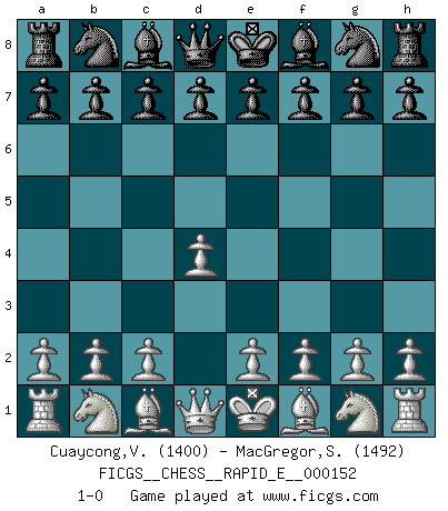 Last move : 1-0 2015 July 1 14:55:8 [Event "FICGS__CHESS__RAPID_E__000152"] [Site "FICGS"] [Date "2015.05.31"] [Round "1"] [White "Cuaycong,Virgilio"] [Black "MacGregor,Steven"] [Result "1-0"] [WhiteElo "1400"] [BlackElo "1492"] 1.d4 1-0 This chess game has been lost on time (started : 2015.05.31 18:6:41) Queen's pawn Player White won this chess game. Follow this game move after move (download)Combinations have always been the most intriguing aspect of Chess. The masters look for them, the public applauds them, the critics praise them. It is because combinations are possible that Chess is more than a lifeless mathematical exercise. They are the poetry of the game; they are to Chess what melody is to music. They represent the triumph of mind over matter. (Reuben Fine) Oft bringt ein stiller Zug das Erdbeben. (Richard Reti) La belleza de un movimiento no se refleja solo en su apariencia, sino en el pensamiento detrás de él. (Siegbert Tarrasch) Soyez une menace à chaque fois que vous vous asseyez pour jouer. (Ken Smith) Winning isn't everything... but losing is nothing. (Mednis)