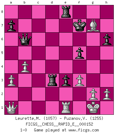 Last move : 1-0 2015 September 11 2:19:39 [Event "FICGS__CHESS__RAPID_E__000152"] [Site "FICGS"] [Date "2015.05.31"] [Round "1"] [White "Leurette,Marc-Antoine"] [Black "Puzanov,Vasyl"] [Result "1-0"] [WhiteElo "1057"] [BlackElo "1255"] 1.e4 e5 2.Nf3 Nc6 3.Bc4 Nf6 4.Ng5 d5 5.exd5 Na5 6.Bb5+ c6 7.dxc6 bxc6 8.Bd3 h6 9.Ne4 Be7 10.Nbc3 O-O 11.Nxf6+ Bxf6 12.O-O Be6 13.b3 Nb7 14.Be4 Bd5 15.Nxd5 cxd5 16.Bf5 e4 17.c3 Nd6 18.Bg4 Qb6 19.b4 Be5 20.Re1 f5 21.Bh5 Nf7 22.d3 Bxc3 23.Bd2 Bxa1 24.Qxa1 Rad8 25.dxe4 dxe4 26.Bc3 Rfe8 27.Bxf7+ Kxf7 28.a3 Rd3 29.Bxg7 e3 30.f3 1-0 Two knights defense Kingside Castling by player Black (move 10) Kingside Castling by player White (move 12) Player White won this chess game. Follow this game move after move (download)I'd rather have a Pawn than a finger. (Reuben Fine) Wenn Spassky eine Figur opfert kannst du genauso gut aufgeben. Aber wenn Tal eine Figur opfert, spiel weiter. Er könnte noch eine weitere opfern, und dann ... wer weiß? (Miguel Najdorf) Aquel que toma al Peón de Caballo de la Reina, se pasará la noche a dormir en la calle. (Anónimo) Les échecs sont utiles à l'exercice de la faculté de penser et à celle de l'imagination. Car nous devons posséder une méthode élaborée pour atteindre des buts partout où nous devons conduire notre raison. (Leibnitz) No man has ever achieved immortality in his own life time. (Unknown)