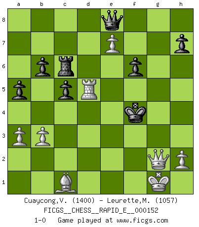 Last move : 1-0 2015 July 9 14:32:36 [Event "FICGS__CHESS__RAPID_E__000152"] [Site "FICGS"] [Date "2015.05.31"] [Round "1"] [White "Cuaycong,Virgilio"] [Black "Leurette,Marc-Antoine"] [Result "1-0"] [WhiteElo "1400"] [BlackElo "1057"] 1.f4 d5 2.Nf3 Nc6 3.e3 a6 4.b3 Nf6 5.Bb2 e6 6.Be2 Bd6 7.O-O O-O 8.d4 b6 9.c4 Ne4 10.Nbd2 Nxd2 11.Qxd2 a5 12.Rac1 Ba6 13.cxd5 Bxe2 14.Qxe2 Nb4 15.a3 Nxd5 16.g3 Qd7 17.e4 Ne7 18.e5 Bxe5 19.dxe5 Nd5 20.Rfd1 Rac8 21.Nd4 c5 22.Nb5 Rfd8 23.Nd6 Rc6 24.f5 exf5 25.Rxd5 f4 26.gxf4 f6 27.e6 Qe7 28.Nf5 Qe8 29.Rxd8 Qxd8 30.e7 Qe8 31.Qg2 Kf7 32.Qxg7+ Ke6 33.Rd1 Kxf5 34.Rd5+ Ke4 35.Qg2+ Kxf4 36.Bc1+ 1-0 Bird's Opening Kingside Castling by player White (move 7) Kingside Castling by player Black (move 7) Player White won this chess game. Follow this game move after move (download)Before the endgame, the Gods have placed the middle game. (Siegbert Tarrasch) Bobby Fischer ist kein Vorbild für die heutige Jugend. (Viktor Kortschnoi) El Ajedrez demanda una total concentración. (Bobby Fischer) Les pièces de l'échiquier étaient impitoyables. Elles le retenaient, elles l'absorbaient. Il y avait de l'horreur en cela, mais aussi une harmonie unique. Car, qu'y a-t-il dans le monde, à part les échecs ? (V. Nabokov) Perhaps chess is the wrong game for the times (The Chess Master and the Computer, by Garry Kasparov - 2010)