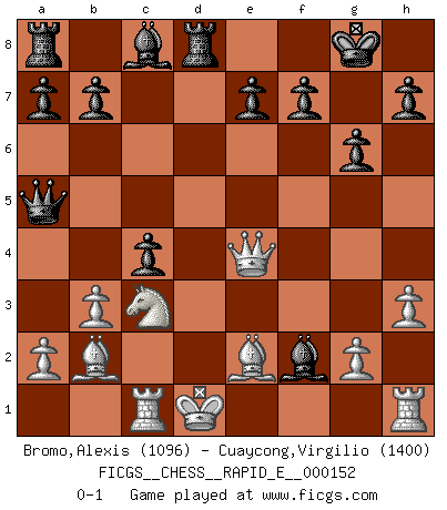 Last move : 0-1 2015 June 17 21:18:10 [Event "FICGS__CHESS__RAPID_E__000152"] [Site "FICGS"] [Date "2015.05.31"] [Round "1"] [White "Bromo,Alexis"] [Black "Cuaycong,Virgilio"] [Result "0-1"] [WhiteElo "1096"] [BlackElo "1400"] 1.d4 Nf6 2.c4 c5 3.e3 g6 4.Nc3 Bg7 5.h3 O-O 6.Nf3 d5 7.b3 Nc6 8.Bb2 Qa5 9.Be2 Ne4 10.Qc2 cxd4 11.exd4 Nxd4 12.Nxd4 Bxd4 13.Rc1 Bxf2+ 14.Kd1 dxc4 15.Qxe4 Rd8+ 0-1 Benoni defense Kingside Castling by player Black (move 5) Player Black won this chess game. Follow this game move after move (download)All Chess players should have a hobby. (Savielly Tartakower) Wenn ich gewinne bin ich ein Genie. Wenn nicht, dann bin ich keines. (Robert James Fischer) Por tratar de evitar la pérdida de una pieza, muchas personas han perdido una partida de Ajedrez. (Savielly Tartakover) La conception d'un plan est le processus par lequel un joueur exploite les avantages de sa position tout en s'efforçant d'en réduire au minimum les inconvénients. Afin de garantir le succès, un plan doit toujours se fonder sur un diagnostic objectif des particularités d'une position. La conception d'un plan est d'autant plus difficile que la position est équilibrée, et grandement facilitée lorsqu'il n'existe qu'un seul plan susceptible de répondre aux exigences de la position. (Harry Golombek) Mac users swear by their computers. PC users swear at their computers. (Author unknown)