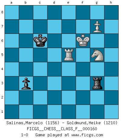 Last move : 1-0 2016 July 5 8:49:0 [Event "FICGS__CHESS__CLASS_F__000160"] [Site "FICGS"] [Date "2015.06.01"] [Round "1"] [White "Salinas,Marcelo"] [Black "Goldmund,Heike"] [Result "1-0"] [WhiteElo "1156"] [BlackElo "1210"] 1.e3 d5 2.Qh5 Nf6 3.Qe5 e6 4.Nc3 Bd6 5.Qd4 O-O 6.Nf3 c5 7.Qh4 Nc6 8.Ng5 d4 9.Nce4 h6 10.Nxf6+ Qxf6 11.Nf3 Qf5 12.Bd3 Qf6 13.Qxf6 gxf6 14.exd4 cxd4 15.c3 Bc5 16.b4 Bb6 17.O-O e5 18.a4 a6 19.a5 Bc7 20.Be4 Bd7 21.d3 dxc3 22.Ra4 Kg7 23.b5 axb5 24.Bxc6 Bxc6 25.Rh4 Rh8 26.d4 e4 27.Rg4+ Kh7 28.d5 Bxd5 29.Nd4 Rxa5 30.Rh4 Bb6 31.Rxh6+ Kg8 32.Nf5 Bc7 33.Ne7+ Kg7 34.Nxd5 Be5 35.Rxh8 Kxh8 36.f4 Bd4+ 37.Be3 Bxe3+ 38.Nxe3 b4 39.Rb1 Rb5 40.Rb3 Kg7 41.g4 Kf8 42.Kf1 Ke7 43.Ke1 Kd6 44.Kd1 Kc5 45.h4 Kd4 46.Ke2 Kc5 47.h5 Ra5 48.h6 Kb5 49.h7 Ra8 50.Nc2 Kc4 51.Rxb4+ Kc5 52.Rxe4 Rh8 53.Kd3 Rxh7 54.Rc4+ Kd5 55.Ne3+ Kd6 56.Rxc3 Rh3 57.Ke4 Rh1 58.Rd3+ Kc6 59.Rb3 Re1 60.g5 fxg5 61.fxg5 Rg1 62.Kf4 Rh1 63.Rc3+ Kd6 64.Rb3 Kc6 65.Kf5 Rg1 66.Rc3+ Kd7 67.Kf6 b6 68.Rd3+ Kc7 69.Nc4 b5 70.Ne5 Rf1+ 71.Nf3 Kc6 72.Kxf7 Kc5 73.Kg7 Rf2 74.Re3 Rg2 75.Re5+ Kc6 76.g6 b4 77.Kf6 Rg3 78.Ng5 b3 79.g7 1-0 Van't Kruijs Opening Kingside Castling by player Black (move 5) Kingside Castling by player White (move 17) 10 pieces endgame at move 56 : White KRNPP , Black KRPPP WHITE : King + 1 Rook 1 Knight 2 Pawns BLACK : King + 1 Rook 3 Pawns 9 pieces endgame at move 60 : White KRNP , Black KRPPP WHITE : King + 1 Rook 1 Knight 1 Pawn BLACK : King + 1 Rook 3 Pawns 8 pieces endgame at move 61 : White KRNP , Black KRPP WHITE : King + 1 Rook 1 Knight 1 Pawn BLACK : King + 1 Rook 2 Pawns 7 pieces endgame at move 72 : White KRNP , Black KRP WHITE : King + 1 Rook 1 Knight 1 Pawn BLACK : King + 1 Rook 1 Pawn Player White won this chess game. Follow this game move after move (download)In a gambit you give up a Pawn for the sake of getting a lost game. (Samuel Standige Boden) Ich trinke, ich rauche, ich spiele, ich liebe Frauen aber Fernschach ist ein Laster, das ich nicht habe. (Mikhail Nekhemyevich Tal) ¿Quién es tu oponente esta tarde? Esta tarde mi oponente son las piezas negras. (Akiba Rubinstein) Les échecs c'est le défi de l'alpiniste, toujours plus haut, prêt à tout pour monter à l'assaut du Roi ennemi. Les échecs, c'est de la musique en mouvement, un ballet majestueux pour les yeux. C'est de la poésie composée par les fantômes du passé qui au même titre que Rimbaud ou Verlaine méritent notre admiration. Les échecs, c'est de la peinture ou le moindre mouvement modifie le tableau pour en faire un Picasso ou un Van Gogh. Les échecs, c'est tout et rien, c'est la vie et la mort. Jjulie33 sur le forum de France-Echecs. The problem with troubleshooting is that trouble shoots back. (Anonymous)