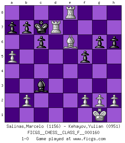 Last move : 1-0 2015 November 21 19:15:40 [Event "FICGS__CHESS__CLASS_F__000160"] [Site "FICGS"] [Date "2015.06.01"] [Round "1"] [White "Salinas,Marcelo"] [Black "Kehayov,Yulian"] [Result "1-0"] [WhiteElo "1156"] [BlackElo "0951"] 1.e3 e5 2.Bc4 d5 3.Bb3 c6 4.Qh5 g6 5.Qxe5+ Qe7 6.Qxh8 Bd7 7.Qd4 Na6 8.a3 Qc5 9.Nf3 Qxd4 10.exd4 Bg7 11.O-O O-O-O 12.d3 f5 13.c4 dxc4 14.dxc4 Nf6 15.Bg5 h6 16.Bxf6 Bxf6 17.Ne5 Be8 18.Rd1 Nc7 19.Nc3 Ne6 20.Nf3 Nxd4 21.Nxd4 Bxd4 22.c5 Bxc5 23.Be6+ Kb8 24.Rxd8+ Kc7 25.Rxe8 Kb6 26.a4 Bd4 27.a5+ Kc7 28.Rd1 Bxc3 29.Rd7+ 1-0 Van't Kruijs Opening Kingside Castling by player White (move 11) Queenside Castling by player Black (move 11) Player White won this chess game. Follow this game move after move (download)You need not play well - just help your opponent to play badly. (Genrikh Chepukaitis) Offensichtlich kennt Kasparow nichts anderes als Schach, und ich könnte 500 weitere Spieler dieser Sorte benennen. (Judith Polgar) Con o sin el título, Bobby Fischer fue sin lugar a dudas el mas grande jugador de su época. (Burt Hochberg) Le génie consiste à savoir transgresser les règles au moment opportun. (Teichmann) The arrogant army will lose certainly the battle. (Chinese proverb)