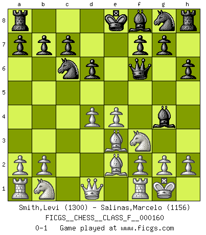 Last move : 0-1 2015 August 3 7:48:17 [Event "FICGS__CHESS__CLASS_F__000160"] [Site "FICGS"] [Date "2015.06.01"] [Round "1"] [White "Smith,Levi"] [Black "Salinas,Marcelo"] [Result "0-1"] [WhiteElo "1300"] [BlackElo "1156"] 1.e4 e6 2.d4 d6 3.Nf3 Nc6 4.Be3 e5 5.c3 Bg4 6.Be2 h6 7.O-O exd4 8.cxd4 Qf6 0-1 This chess game has been lost on time (started : 2015.06.01 18:29:19) Lengfellner system Kingside Castling by player White (move 7) Player Black won this chess game. Follow this game move after move (download)The winner of the game is the player who makes the next-to-last mistake. (Savielly Tartakover) Verschiedene, sehr schätzbare und im Laufe des Lebens nützliche Eigenschaften des Geistes können durch das Schachspiel erworben und gekräftigt werden, so dass sie zu Gewohnheiten werden, die uns nie im Stich lassen. (Benjamin Franklin) Nos gusta pensar. (Gary Kasparov) Même un GMI sait rarement calculer sur plus de cinq coups une attaque à sacrifices. (Rudolf Spielmann) I find television to be very educating. Every time somebody turns on the set, I go in the other room and read a book. (Groucho Marx)