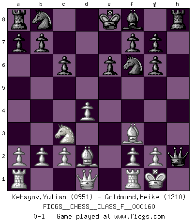 Last move : 0-1 2015 June 25 14:36:42 [Event "FICGS__CHESS__CLASS_F__000160"] [Site "FICGS"] [Date "2015.06.01"] [Round "1"] [White "Kehayov,Yulian"] [Black "Goldmund,Heike"] [Result "0-1"] [WhiteElo "0951"] [BlackElo "1210"] 1.e4 d5 2.exd5 Qxd5 3.Nc3 Qa5 4.Nf3 Nf6 5.Be2 Bf5 6.O-O e6 7.d4 c6 8.Bd2 Qc7 9.Nh4 Bg6 10.Nxg6 hxg6 11.Bf3 Qxh2+ 0-1 Scandinavian (centre counter) defense Kingside Castling by player White (move 6) Player Black won this chess game. Follow this game move after move (download)Chess is like life. (Boris Spassky) Wie, soll nun auch die Opposition abgeschafft werden? Ja, es tut mir leid, Ihnen diesen Schmerz nicht ersparen zu können. (Aaron Nimzowitsch) Me siento como si fuera una pieza en una partida de Ajedrez, cuando mi oponente me indica: esa pieza no puede ser movida. (Soren Kierkegaard) J'ai vu le vaincu d'Echecs jouer des années durant dans l'espoir de la fête de la victoire. Car tu es plus riche de ce qu'elle existe si même elle n'est point pour toi. Ainsi de la perle du fond des mers. (Antoine de Saint-Exupéry) Without deviation from the norm, progress is not possible. (Frank Zappa)