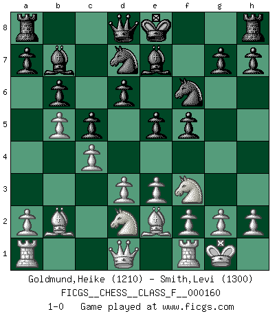Last move : 1-0 2015 July 29 18:57:52 [Event "FICGS__CHESS__CLASS_F__000160"] [Site "FICGS"] [Date "2015.06.01"] [Round "1"] [White "Goldmund,Heike"] [Black "Smith,Levi"] [Result "1-0"] [WhiteElo "1210"] [BlackElo "1300"] 1.b4 e5 2.Bb2 d6 3.c4 f5 4.e3 Nf6 5.Nf3 Nbd7 6.d3 c5 7.b5 b6 8.Be2 Bb7 9.O-O Be7 10.Nbd2 1-0 This chess game has been lost on time (started : 2015.06.01 18:29:19) Polish (Sokolsky) opening Kingside Castling by player White (move 9) Player White won this chess game. Follow this game move after move (download)By this measure (on the gap between Fischer & his contemporaries), I consider him the greatest world champion. (Garry Kasparov) Pläne sind die Träume des Verständigen. (Ernst Freiherr von Feuchtersleben) Todavía soy una víctima del Ajedrez. Tiene toda la belleza del arte y mucho mas. No puede ser comercializado. El Ajedrez es mas puro que el arte en su posición social. (Marcel Duchamp) On a dit que l'homme se distingue de l'animal par le fait qu'il achète plus de livres qu'il ne peut en lire. Je voudrais suggérer qu'inclure à la liste des livres quelques livres d'échecs rendrait la distinction manifeste. (Edward Lasker) Follow your passion, and success will follow you. (Arthur Buddhold)