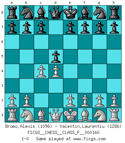 Last move : 1-0 2015 July 12 4:18:31 [Event "FICGS__CHESS__CLASS_F__000160"] [Site "FICGS"] [Date "2015.06.01"] [Round "1"] [White "Bromo,Alexis"] [Black "Valentin,Laurentiu"] [Result "1-0"] [WhiteElo "1096"] [BlackElo "1286"] 1.d4 d5 2.c4 1-0 This chess game has been lost on time (started : 2015.06.01 18:29:19) Queen's Gambit Player White won this chess game. Follow this game move after move (download)The only thing Chess players have in common is Chess. (Lodewijk Prins) Ivan Sokolov treibt mich als Beifahrer an mit go Loeky go - . (Loek van Wely) Los problemas de Ajedrez exigen del compositor las mismas virtudes que caracterizan todo el arte de valor: originalidad, invención, concisión, armonía, complejidad e insinceridad explendida. (Vladimir Nabokov) Plusieurs personnes se sont demandées comment Tal faisait pour gagner... En fait, c'est très simple ! Il met ses pièces au centre de l'échiquier et les sacrifie quelque part ! (David Bronstein) As a goal marker shodan is important. As a destination it is a poor place to stop. (Thomas Tamayo)