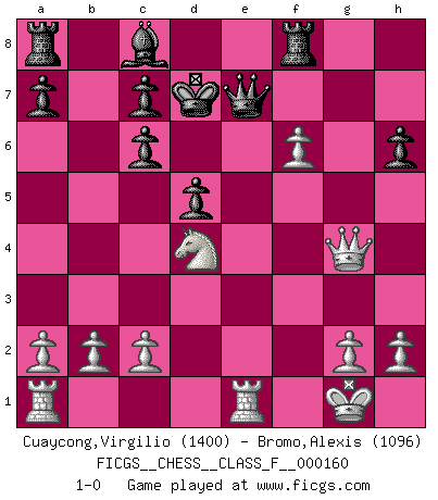Last move : 1-0 2015 June 21 10:56:19 [Event "FICGS__CHESS__CLASS_F__000160"] [Site "FICGS"] [Date "2015.06.01"] [Round "1"] [White "Cuaycong,Virgilio"] [Black "Bromo,Alexis"] [Result "1-0"] [WhiteElo "1400"] [BlackElo "1096"] 1.e4 e5 2.Nf3 Nc6 3.Bb5 d6 4.d4 h6 5.Bxc6+ bxc6 6.O-O Nf6 7.dxe5 Nxe4 8.Re1 d5 9.Nbd2 Nxd2 10.Bxd2 Be7 11.Nd4 Bb7 12.Qg4 Bg5 13.f4 Be7 14.Qxg7 Rf8 15.e6 Qd6 16.exf7+ Rxf7 17.Qg8+ Rf8 18.Qg4 Bc8 19.f5 Qf6 20.Bb4 Kd7 21.Bxe7 Qxe7 22.f6 1-0 Ruy Lopez : Old Steinitz defense Kingside Castling by player White (move 6) Player White won this chess game. Follow this game move after move (download)You can only get good at Chess if you love the game. (Bobby Fischer) Im Schach gewinnt jeder. Hat man Freunde am Spiel - und das ist die Hauptsache - ist auch der Verlust einer Partie kein Unglück. (David Bronstein) Robert Fischer es la ley hacia si mismo. (Larry Evans) Aux échecs, l'amour-propre est satisfait quand on remporte la victoire, mais il n'y a pas de honte à être battu. (Benjamin Franklin) The age of a woman doesn't mean a thing. The best tunes are played on the oldest fiddles. (Ralph Waldo Emerson)