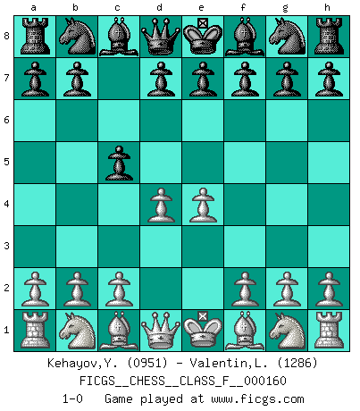 Last move : 1-0 2015 July 12 4:18:31 [Event "FICGS__CHESS__CLASS_F__000160"] [Site "FICGS"] [Date "2015.06.01"] [Round "1"] [White "Kehayov,Yulian"] [Black "Valentin,Laurentiu"] [Result "1-0"] [WhiteElo "0951"] [BlackElo "1286"] 1.e4 c5 2.d4 1-0 This chess game has been lost on time (started : 2015.06.01 18:29:19) Sicilian : Smith-Morra gambit Player White won this chess game. Follow this game move after move (download)When you see a good move, look for a better one. (Emanuel Lasker) Der Vorposten provoziert a) eine Basis für neue Angriffe und b) eine Schwächung der gegnerischen Widerstandskraft in der fraglichen Linie. (Aaron Nimzowitsch) El Ajedrez es parte de la cultura, y si una cultura esta en decadencia, entonces también el Ajedrez declinará. (Mikhail Botvinnik) Une platitude souvent récitée à propos des Echecs est qu'une des choses les plus difficiles à réaliser est de gagner une position gagnante. Cela ne manque pas de sens mais, pour ma part, j'ai toujours trouvé plus difficile de gagner une position perdante. (Tim Krabbe) Fear is the path to the dark side. Fear leads to anger; anger leads to hate; hate leads to suffering. I sense much fear in you. (Master Yoda in Star Wars ep.1)