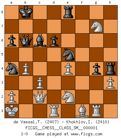 Last move : 1-0 2007 February 16 17:37:44 [Event "FICGS__CHESS__CLASS_SM__000001"] [Site "FICGS"] [Date "2006.05.30"] [Round "1"] [White "de Vassal,Thibault"] [Black "Khokhlov,Igor"] [Result "1-0"] [WhiteElo "2407"] [BlackElo "2410"] 1.e4 c5 2.Nf3 d6 3.d4 cxd4 4.Nxd4 Nf6 5.Nc3 a6 6.Be3 Ng4 7.Bc1 Nc6 8.h3 Nge5 9.f4 Nd7 10.Be3 e6 11.Qh5 Nf6 12.Qf3 Be7 13.O-O-O Qc7 14.g4 Nd7 15.g5 b5 16.Kb1 b4 17.Nce2 Bb7 18.f5 Nce5 19.Qg2 Nc5 20.Ng3 O-O-O 21.Rg1 h6 22.gxh6 gxh6 23.Qd2 Bg5 24.Bxg5 hxg5 25.Qxb4 Rh4 26.Qd2 Rg8 27.Ka1 Qb6 28.b4 Na4 29.c3 Kb8 30.Qc2 g4 31.fxe6 fxe6 32.Nge2 Bc6 33.Nxe6 Re8 34.Ng7 1-0 Sicilian : Najdorf, Byrne (English) attack Queenside Castling by player White (move 13) Queenside Castling by player Black (move 20) Player White won this chess game. Follow this game move after move (download)Chess is a matter of delicate judgment, knowing when to punch and how to duck. (Bobby Fischer) Ich erzeugte keinen Neid, da mich die Schachspieler als Musiker und die Musiker als Schachspieler betrachteten. (Mark Taimanov) Realmente no sabemos como el juego fue inventado, aunque hay sospechas. Tan pronto como descubramos a los culpables, se los haremos saber. (Bruce Pandolfini) La vie est comme un jeu d'échecs : nous esquissons un plan, mais celui-ci est tributaire de ce que daignent faire l'adversaire aux échecs et le destin dans la vie. (Arthur Schopenhauer) Locking firmely the window serves nothing, only small thiefs pass through there, the big thiefs enter through the front door. (Luc-Olivier Leclerc)