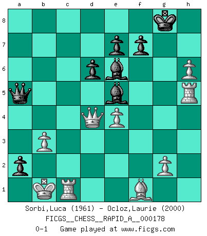 Last move : 0-1 2015 June 22 15:25:24 [Event "FICGS__CHESS__RAPID_A__000178"] [Site "FICGS"] [Date "2015.06.04"] [Round "1"] [White "Sorbi,Luca"] [Black "Ocloz,Laurie"] [Result "0-1"] [WhiteElo "1961"] [BlackElo "2000"] 1.e4 c5 2.Nf3 d6 3.d4 cxd4 4.Nxd4 Nf6 5.Nc3 a6 6.Be3 Ng4 7.Bg5 h6 8.Bh4 g5 9.Bg3 Bg7 10.h3 Ne5 11.Qd2 Nec6 12.Nb3 b5 13.O-O-O b4 14.Nd5 a5 15.Kb1 a4 16.Nc5 O-O 17.Nd3 a3 18.b3 Na6 19.N3xb4 Naxb4 20.Nxb4 Nxb4 21.Qxb4 Qc7 22.h4 Be6 23.Qd2 Rfb8 24.Rc1 Bc3 25.Qe2 Qa5 26.Qd3 Rb6 27.f4 Rab8 28.Be1 Bxe1 29.hxg5 Bd2 30.gxh6 Bxf4 31.Qd4 Be5 32.Rh5 Rxb3+ 33.cxb3 Rxb3+ 34.axb3 a2+ 0-1 Sicilian : Najdorf, Byrne (English) attack Queenside Castling by player White (move 13) Kingside Castling by player Black (move 16) Player Black won this chess game. Follow this game move after move (download)Half the variations which are calculated in a tournament game turn out to be completely superfluous. Unfortunately, no one knows in advance which half. (Jan Tinman) Ein Schachgenie ist jemand der verdammt gut Schach spielt. (Jonathan Levitt) Ayuda a tus piezas para que ellas te puedan ayudar. (Paul Morphy) Pour moi, les échecs ne sont pas un jeu mais un art. (Alexandre Alekhine) The man who strikes first admits that his ideas have given out. (Chinese proverb)