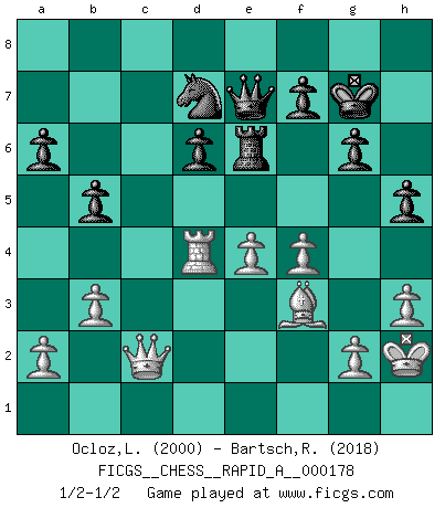 Last move : 1/2-1/2 2015 June 13 11:54:58 [Event "FICGS__CHESS__RAPID_A__000178"] [Site "FICGS"] [Date "2015.06.04"] [Round "1"] [White "Ocloz,Laurie"] [Black "Bartsch,Reinhard Andrea"] [Result "1/2-1/2"] [WhiteElo "2000"] [BlackElo "2018"] 1.e4 c5 2.Nf3 d6 3.d4 cxd4 4.Nxd4 Nc6 5.c4 Nf6 6.Nc3 g6 7.Be2 Nxd4 8.Qxd4 Bg7 9.Bg5 O-O 10.Qd2 Be6 11.Rd1 a6 12.O-O Rc8 13.Rfe1 Re8 14.b3 Qa5 15.Rc1 h5 16.h3 Bd7 17.f3 Kh7 18.Rc2 Be6 19.Rec1 Nd7 20.Be3 Nc5 21.Rb1 Qb4 22.Qc1 Nd7 23.f4 Qa5 24.Nd5 Bxd5 25.cxd5 Rxc2 26.Qxc2 Qb4 27.Rc1 Bd4 28.Qd3 e5 29.dxe6 Bxe3+ 30.Qxe3 Rxe6 31.Bf3 Nf6 32.Rc4 Qa5 33.Ra4 Qc7 34.Rd4 b5 35.Kh2 Qa7 36.Qc3 Qe7 37.Qd3 Nd7 38.Qc2 Kg7 1/2-1/2 Sicilian Kingside Castling by player Black (move 9) Kingside Castling by player White (move 12) This chess game ended in a draw. Follow this game move after move (download)There are two classes of men; those who are content to yield to circumstances and who play whist; those who aim to control circumstances, and who play Chess. (Mortimer Collins) Woher wissen wir, daß der Neanderthaler Blindschach gespielt hat? -- Bei Ausgrabungen wurden keine Schachbretter und Figuren gefunden. (Anonymous) Una buena ofensiva y una buena defensa, comienzan ambas con un buen desarrollo. (Bruce A. Moon) Les sacrifices démontrent seulement que quelqu'un a gaffé. (Savielly Tartacover) The human is the only animal species whose members are able to talk themselves into difficulties that would not otherwise exist. (Wendell Johnson)