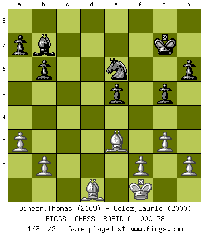 Last move : 1/2-1/2 2015 July 13 16:21:36 [Event "FICGS__CHESS__RAPID_A__000178"] [Site "FICGS"] [Date "2015.06.04"] [Round "1"] [White "Dineen,Thomas"] [Black "Ocloz,Laurie"] [Result "1/2-1/2"] [WhiteElo "2169"] [BlackElo "2000"] 1.d4 Nf6 2.c4 e6 3.Nf3 b6 4.g3 c6 5.Bg2 d5 6.O-O h6 7.Nc3 Bb4 8.Ne5 O-O 9.Bf4 Bb7 10.Qb3 Qe7 11.cxd5 exd5 12.Rac1 Re8 13.Rfd1 Na6 14.a3 Bd6 15.e4 Nxe4 16.Nxe4 Bxe5 17.dxe5 dxe4 18.e6 Qxe6 19.Qxe6 fxe6 20.Rd7 Bc8 21.Rd6 Bb7 22.Bxe4 e5 23.Be3 Rad8 24.Bxc6 Rxd6 25.Bxe8 Nc7 26.Bh5 Ne6 27.Kf1 g5 28.Rd1 Rxd1+ 29.Bxd1 Kg7 1/2-1/2 Queen's Indian : 4.g3 Kingside Castling by player White (move 6) Kingside Castling by player Black (move 8) This chess game ended in a draw. Follow this game move after move (download)Personally, I rather look forward to a computer program winning the world Chess Championship. Humanity needs a lesson in humility. (Richard Dawkings) Bis jetzt ist Weiß einer wohlbekannten Analyse gefolgt. Aber jetzt begeht er einen schrecklichen Fehler: Er beginnt seinen eigenen Kopf zu benutzen. (Siegbert Tarrasch) El sobresalir en el Ajedrez es un signo de una mente intrigante. (Sir Arthur Conan Doyle) Toutes choses étant égales, c'est la conviction qui gagne. Alliée à une volonté de vaincre, elle sert de détonateur, suscite des idées, disperse les doutes et aide à penser clairement. (Robert Fischer) May the force be with you. (Han Solo in Star Wars ep.4)