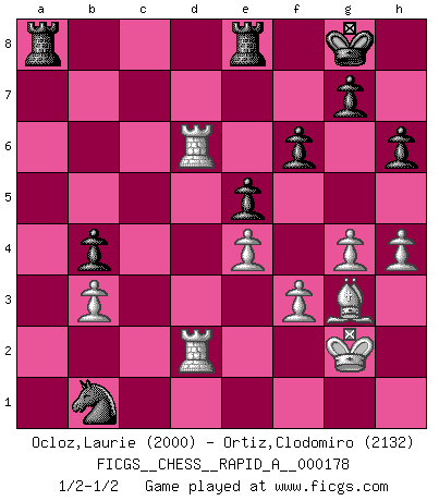 Last move : 1/2-1/2 2015 June 10 23:26:27 [Event "FICGS__CHESS__RAPID_A__000178"] [Site "FICGS"] [Date "2015.06.04"] [Round "1"] [White "Ocloz,Laurie"] [Black "Ortiz,Clodomiro"] [Result "1/2-1/2"] [WhiteElo "2000"] [BlackElo "2132"] 1.d4 Nf6 2.c4 e6 3.Nf3 b6 4.g3 Bb7 5.Bg2 Be7 6.Nc3 O-O 7.Bf4 Bb4 8.Qb3 Bxc3+ 9.Qxc3 d6 10.O-O Re8 11.Rad1 Nbd7 12.b3 a5 13.Ne1 Bxg2 14.Nxg2 Rc8 15.f3 d5 16.g4 h6 17.Bg3 Qe7 18.Ne3 c5 19.dxc5 Nxc5 20.Bh4 dxc4 21.Nxc4 Nd5 22.Qe1 f6 23.Bg3 Nb7 24.e4 b5 25.Nxa5 Nc3 26.Nxb7 Qxb7 27.Rd3 b4 28.Qd2 Qa7+ 29.Rf2 e5 30.Kg2 Qc7 31.Rd7 Qc6 32.h4 Ra8 33.Qd6 Qxd6 34.Rxd6 Nxa2 35.Rc2 Nc3 36.Rcd2 Nb1 37.Rb2 Nc3 38.Rbd2 Nb1 1/2-1/2 Queen's Indian : Anti-Queen's Indian system Kingside Castling by player Black (move 6) Kingside Castling by player White (move 10) This chess game ended in a draw. Follow this game move after move (download)Checkers is for tramps. (Paul Morphy) Du musst Deinen Gegner in einen tiefen dunklen Wald führen wo 2+2=5 ist und wo der Weg, der wieder hinausführt, nur breit genug für einen ist. (Mikhail Nekhemyevich Tal) Los Peones son el alma de una partida de Ajedrez. (Francois Andre Danican Philidor) Je ne crois pas en la psychologie, je crois aux bons coups. (Robert Fischer) Never risk one's whole fortune unless supported by one's entire army. (Niccolo Machiavelli)