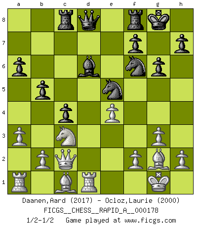 Last move : 1/2-1/2 2015 June 7 22:35:32 [Event "FICGS__CHESS__RAPID_A__000178"] [Site "FICGS"] [Date "2015.06.04"] [Round "1"] [White "Daanen,Aard"] [Black "Ocloz,Laurie"] [Result "1/2-1/2"] [WhiteElo "2017"] [BlackElo "2000"] 1.d4 Nf6 2.c4 e6 3.g3 d5 4.Bg2 dxc4 5.Nf3 a6 6.O-O Nc6 7.e3 Bd7 8.Qe2 Bd6 9.Qxc4 O-O 10.Nc3 b5 11.Qd3 e5 12.a3 exd4 13.Nxd4 Ne5 14.Qc2 c5 15.Nf5 Bxf5 16.Qxf5 c4 17.Rd1 g6 18.Qc2 Rc8 19.e4 1/2-1/2 Catalan : Open, 5.Nf3 Kingside Castling by player White (move 6) Kingside Castling by player Black (move 9) This chess game ended in a draw. Follow this game move after move (download)Chess is so inspiring that I do not believe a good player is capable of having an evil thought during the game. (Wilhelm Steinitz) Ein Teil des Fehlers ist immer korrekt. (Savielly Grigorievitsch Tartakower) EL Ajedrez es como la vida. (Boris Spassky) Un millionnaire : 'Monsieur Steinitz ! Vous ne participez aux tournois que pour l'argent, alors que moi je n'y viens que pour l'honneur.' Steinitz : 'Chacun joue pour ce qu'il n'a pas'... There are two kinds of people in the world, my friend. Those who have a loaded gun and those who dig. You dig ! (Blondie in The Good, The Bad and The Ugly)