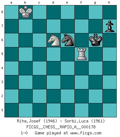 Last move : 1-0 2015 August 30 10:30:23 [Event "FICGS__CHESS__RAPID_A__000178"] [Site "FICGS"] [Date "2015.06.04"] [Round "1"] [White "Riha,Josef"] [Black "Sorbi,Luca"] [Result "1-0"] [WhiteElo "1946"] [BlackElo "1961"] 1.d4 Nf6 2.c4 g6 3.Nc3 Bg7 4.e4 d6 5.Nf3 O-O 6.Be2 e5 7.O-O Nc6 8.d5 Ne7 9.Ne1 Nd7 10.f3 f5 11.Be3 b6 12.Nd3 a5 13.a3 f4 14.Bf2 Ba6 15.Nb5 Nc8 16.b4 axb4 17.axb4 Ne7 18.Qc2 Bxb5 19.Rxa8 Qxa8 20.cxb5 Rc8 21.Rc1 g5 22.g3 Ng6 23.Qc6 Qxc6 24.bxc6 Nf6 25.Ra1 fxg3 26.hxg3 g4 27.Ra7 Bh6 28.Ne1 gxf3 29.Ba6 Rf8 30.Rxc7 Nxe4 31.Rd7 Nxf2 32.Kxf2 e4 33.Nc2 Ne5 34.Rxd6 Ng4+ 35.Kf1 Bg7 36.c7 Be5 37.Rc6 Bxc7 38.Rxc7 e3 39.Nd4 e2+ 40.Bxe2 Ne3+ 41.Ke1 fxe2 42.d6 Re8 43.Nf3 Nd5 44.Rc6 Nf6 45.Rxb6 Re3 46.Nd4 Nd7 47.Rb7 Ne5 48.Nc2 Rd3 49.Kxe2 Rxd6 50.Ne3 Rg6 51.Nf5 Rf6 52.Nd4 Rg6 53.Re7 Nc4 54.Rc7 Nd6 55.Kf3 Rf6+ 56.Kg2 Rf7 57.Rc5 Ne4 58.Re5 Nf6 59.Nc6 Rd7 60.Kf3 Rd3+ 61.Kf4 Rc3 62.b5 Kg7 63.Kf5 Rf3+ 64.Ke6 Rxg3 65.Ne7 Rg1 66.Nd5 Ng4 67.Re4 Nf2 68.Rc4 Re1+ 69.Kd7 Nd3 70.Rc7 Ne5+ 71.Kc8 Nf7 72.b6 Kf8 73.Rc5 Ke8 74.Nc7+ Ke7 75.Nb5 Kf6 76.b7 Re8+ 77.Kc7 Nd8 78.Nd6 Rh8 79.Rf5+ Kg6 80.b8Q Ne6+ 81.Kb7 Rxb8+ 82.Kxb8 1-0 King's Indian : Orthodox, Aronin-Taimanov variation (Yugoslav attack / Mar del Plata variation) Kingside Castling by player Black (move 5) Kingside Castling by player White (move 7) 10 pieces endgame at move 49 : White KRNPPP , Black KRNP WHITE : King + 1 Rook 1 Knight 3 Pawns BLACK : King + 1 Rook 1 Knight 1 Pawn 9 pieces endgame at move 49 : White KRNPP , Black KRNP WHITE : King + 1 Rook 1 Knight 2 Pawns BLACK : King + 1 Rook 1 Knight 1 Pawn 8 pieces endgame at move 64 : White KRNP , Black KRNP WHITE : King + 1 Rook 1 Knight 1 Pawn BLACK : King + 1 Rook 1 Knight 1 Pawn Promotion Queen by player White (move 80) 7 pieces endgame at move 81 : White KRN , Black KRNP WHITE : King + 1 Rook 1 Knight BLACK : King + 1 Rook 1 Knight 1 Pawn 6 pieces endgame at move 82 : White KRN , Black KNP WHITE : King + 1 Rook 1 Knight BLACK : King + 1 Knight 1 Pawn Player White won this chess game. Follow this game move after move (download)The hallmark of the artist is simplicity. (Larry Evans) Dieses schreckliche Gefühl, dass ich gegen eine Maschine spielte, die niemals Fehler macht, zerschmetterte meinen Widerstand. (Mark Taimanov) El jugador blanco perdió porque fallo en recordar la coreccta continuación y tuvo que pensar por sí mismo las movidas. (Siegbert Tarrasch) On croit qu'il y a plus de mauvais joueurs que de bons joueurs, c'est faux : Il y a autant de joueurs qui gagnent que de joueurs qui perdent. (Philippe Geluck) The quality of decision is like the well-timed swoop of a falcon which enables it to strike and destroy its victim. (Sun Tzu)