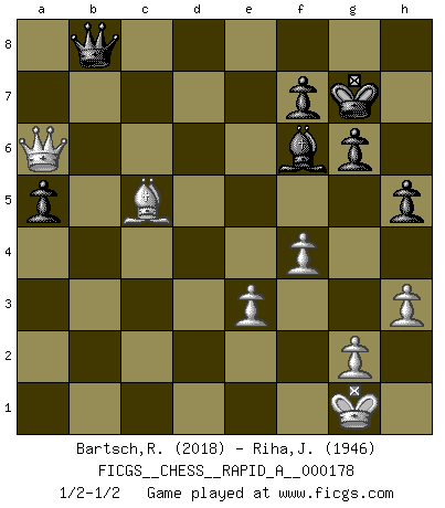 Last move : 1/2-1/2 2015 June 18 15:55:25 [Event "FICGS__CHESS__RAPID_A__000178"] [Site "FICGS"] [Date "2015.06.04"] [Round "1"] [White "Bartsch,Reinhard Andrea"] [Black "Riha,Josef"] [Result "1/2-1/2"] [WhiteElo "2018"] [BlackElo "1946"] 1.d4 Nf6 2.c4 g6 3.Nf3 Bg7 4.Nc3 d5 5.e3 O-O 6.cxd5 Nxd5 7.Bc4 Nxc3 8.bxc3 c5 9.Qe2 Nc6 10.O-O Qc7 11.Ba3 b6 12.Rac1 Rd8 13.Rfd1 e6 14.dxc5 bxc5 15.Rxd8+ Nxd8 16.Nd2 Nb7 17.Nb3 Na5 18.Bb5 Bb7 19.c4 Nxb3 20.axb3 Rd8 21.Rd1 Rxd1+ 22.Qxd1 Qe5 23.Bc1 Qe4 24.f3 Qb1 25.Qd8+ Bf8 26.Qd1 Be7 27.Ba4 e5 28.h3 e4 29.f4 Bf6 30.Qf1 Qd3 31.Qf2 Ba6 32.Ba3 Bxc4 33.Bxc5 Bxb3 34.Bxb3 Qxb3 35.Qd2 Qb8 36.Qd5 a5 37.Qxe4 h5 38.Qc6 Kg7 39.Qa6 1/2-1/2 King's Indian, 3.Nf3 Kingside Castling by player Black (move 5) Kingside Castling by player White (move 10) This chess game ended in a draw. Follow this game move after move (download)Chess is the art which expresses the science of logic. (Mikhail Botvinnik) Ich glaube nicht an Psychologie, ich glaube an gute Züge. (Robert James Fischer) Los tropiezos estan todos ahí en el tablero, esperando que se cometan. (Savielly Tartakover) J'ai vu le vaincu d'Echecs jouer des années durant dans l'espoir de la fête de la victoire. Car tu es plus riche de ce qu'elle existe si même elle n'est point pour toi. Ainsi de la perle du fond des mers. (Antoine de Saint-Exupéry) Those parts of the system that you can hit with a hammer (not advised) are called hardware; those program instructions that you can only curse at are called software. (Anonymous)