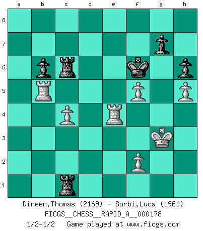 Last move : 1/2-1/2 2015 August 30 2:37:33 [Event "FICGS__CHESS__RAPID_A__000178"] [Site "FICGS"] [Date "2015.06.04"] [Round "1"] [White "Dineen,Thomas"] [Black "Sorbi,Luca"] [Result "1/2-1/2"] [WhiteElo "2169"] [BlackElo "1961"] 1.d4 Nf6 2.c4 e6 3.Nc3 Bb4 4.e3 O-O 5.Bd3 d5 6.Nf3 c5 7.O-O Nc6 8.a3 Bxc3 9.bxc3 dxc4 10.Bxc4 b6 11.Bb2 Na5 12.Bd3 Bb7 13.c4 Rc8 14.Rc1 Qe7 15.Qe2 Be4 16.Bc3 Nc6 17.Bxe4 Nxe4 18.Rfd1 cxd4 19.exd4 Nxc3 20.Rxc3 Qc7 21.Qe4 Ne7 22.Rdc1 h6 23.h3 Rfd8 24.Ne5 Qd6 25.Rd3 Rc7 26.g3 Nc6 27.Rcd1 Rf8 28.h4 Re8 29.h5 Ne7 30.Re1 f6 31.Ng6 Nxg6 32.Qxg6 Rce7 33.Qg4 e5 34.Re4 Qe6 35.Qxe6+ Rxe6 36.d5 R6e7 37.a4 f5 38.Re2 Rc7 39.Rc2 e4 40.Rd4 Kf7 41.a5 Rec8 42.d6 Rd7 43.Rb2 Rc6 44.Rb5 Ke6 45.g4 R7xd6 46.gxf5+ Kf6 47.Rxe4 Rd1+ 48.Kg2 Rc1 49.axb6 axb6 50.Kg3 1/2-1/2 Nimzo-Indian : 4.e3 O-O, 5.Bd3 d5 Kingside Castling by player Black (move 4) Kingside Castling by player White (move 7) This chess game ended in a draw. Follow this game move after move (download)Openings teach you openings. Endgames teach you chess ! (Stephan Gerzadowicz) Alle Schachspieler sollten auch ein Hobby haben. (Savielly Grigorievitsch Tartakower) El Ajedrez no es una pizca de inferior al violín, y tenemos un gran número de violinistas profesionales. (Mikhail Botvinnik) Nous vivons dans un monde échiquéen : chaque jour qui passe est un défi à relever. (Philosophe Sasha) We're missing something. (Gregory House, House M.D.)