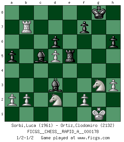 Last move : 1/2-1/2 2015 July 8 6:58:48 [Event "FICGS__CHESS__RAPID_A__000178"] [Site "FICGS"] [Date "2015.06.04"] [Round "1"] [White "Sorbi,Luca"] [Black "Ortiz,Clodomiro"] [Result "1/2-1/2"] [WhiteElo "1961"] [BlackElo "2132"] 1.e4 e5 2.Nf3 Nc6 3.Bc4 Nf6 4.d3 Bc5 5.c3 d6 6.O-O a5 7.h3 O-O 8.Re1 h6 9.d4 Ba7 10.Bb3 Re8 11.Bc2 Bd7 12.Be3 exd4 13.cxd4 Nb4 14.Nbd2 Nxc2 15.Qxc2 Nxe4 16.Nxe4 Bf5 17.Bxh6 gxh6 18.d5 Qe7 19.Nfd2 Qh4 20.g3 Qxg3+ 21.Nxg3 Bxc2 22.Rxe8+ Rxe8 23.Rc1 Bd3 24.Rxc7 Re5 25.Rxb7 Bc5 1/2-1/2 Two knights defense (Modern Bishop's Opening) Kingside Castling by player White (move 6) Kingside Castling by player Black (move 7) This chess game ended in a draw. Follow this game move after move (download)The game of chess is the touchstone of the intellect. (Goethe) Obwohl ich alt bin, darf mir niemand den Finger in den Mund stecken, sonst beisse ich. (Wilhelm Steinitz) En la perfecta combinación de Ajedrez como en una historia corta de primera clase, toda la trama y contra trama deberá conducir hacia un final sorprendente, el interes no es mitigado hasta el último momento. (Yates and Winter) Les échecs sont utiles à l'exercice de la faculté de penser et à celle de l'imagination. Car nous devons posséder une méthode élaborée pour atteindre des buts partout où nous devons conduire notre raison. (Leibnitz) Gambling : The sure way of getting nothing from something. (Wilson Mizner)