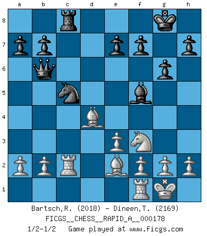 Last move : 1/2-1/2 2015 June 23 6:51:11 [Event "FICGS__CHESS__RAPID_A__000178"] [Site "FICGS"] [Date "2015.06.04"] [Round "1"] [White "Bartsch,Reinhard Andrea"] [Black "Dineen,Thomas"] [Result "1/2-1/2"] [WhiteElo "2018"] [BlackElo "2169"] 1.d4 Nf6 2.c4 g6 3.Nf3 Bg7 4.Nc3 d5 5.e3 O-O 6.Be2 c5 7.dxc5 Qa5 8.cxd5 Nxd5 9.Qxd5 Bxc3+ 10.Bd2 Rd8 11.Qxd8+ Qxd8 12.Bxc3 Nd7 13.Rd1 Qc7 14.O-O Nxc5 15.Be5 Qb6 16.Bd4 Bf5 17.Rc1 Rc8 18.Rc4 Be6 19.Rc2 Bf5 1/2-1/2 King's Indian, 3.Nf3 Kingside Castling by player Black (move 5) Kingside Castling by player White (move 14) This chess game ended in a draw. Follow this game move after move (download)Don't even mention losing to me. I can't stand to think of it. (Bobby Fischer) Um dein Spiel zu verbessern musst du zuallererst das Endspiel studieren, denn diese kann unabhängig studiert werden. Die Eröffnung und das Mittelspiel müssen immer in Bezug gesetzt werden zum Endspiel. (José Raúl Capablanca) Fischer es una tragedia del Ajedrez Americano a la par con Morphy y Pillsbury. (Mig Greengard) La tactique est l'élément le plus important du milieu de jeu. (Siegbert Tarrasch) No, I am still playing. (Anatoly Karpov)