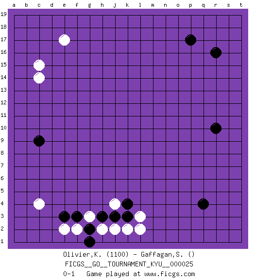 Last move : 0-1 2007 May 25 17:4:56 [Event "FICGS__GO__TOURNAMENT_KYU__000025 "] [Site "FICGS"] [Date "2007.03.04"] [Round "1"] [Black "Olivier,Katherine "] [White "Gaffagan,Steven "] [Result "0-1"] [Rating 1 "1100"] 1.r16 c4 2.q4 e17 3.p17 c15 4.e3 l2 5.h3 j4 6.k3 l3 7.c9 c14 8.r10 k2 9.j3 j2 10.k4 h2 11.g2 f2 12.f3 e2 13.g1 g3 0-1 This go game has been lost on time (started : 2007.03.04 15:36:14) Here are the names of the openings (joseki) played in the four corners : Corner d4 : c4 e3Komoku (Somok, Xiao~mu`) 3-4 Point. The komoku (3-4) point is the traditional corner enclosure move..Ikken Kakari (Hankan Keolch'im, Yi Gua`jiao~, 1-Space Low Pincer). The small knight move is the basic approach move to the 3-4 point stone. It has been continually used for over four centuries. There are limitless variations, with new moves constantly being discovered. Black 2 opens the door to a treaure store of joseki. Corner q4 : q4 l2Hoshi (Hwajeom, Seongjeom, Xingwei`) 4-4 Point. The star or hoshi (4-4) point, emphasizing influence at the potential expense of territory. Player White won this Go (weiqi, baduk) game.Follow this game move after move (download ) Go is not a blocking game, it's a game of action. (Pierre Audouard) All art requires courage. (Anne Tucker)